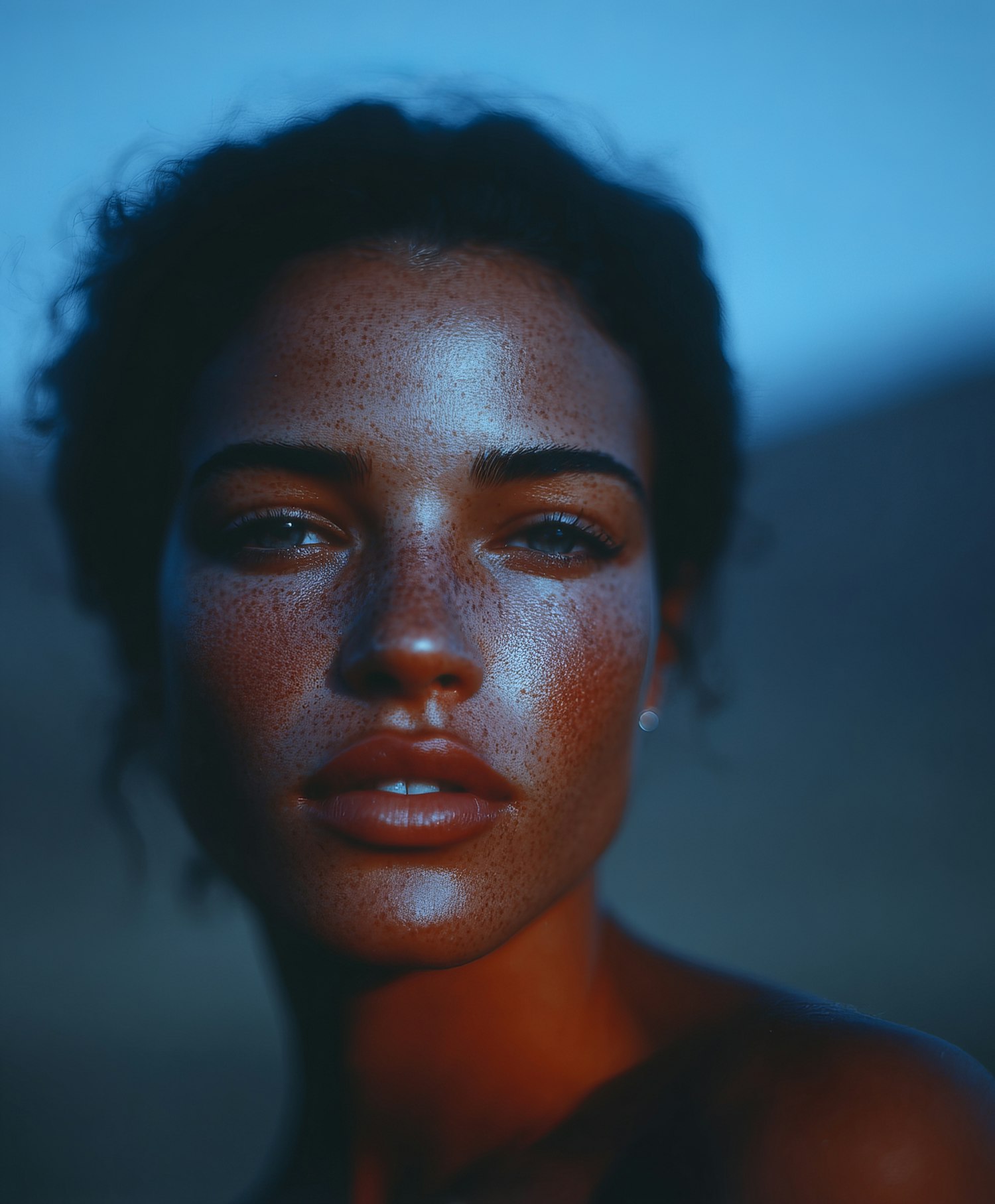 Close-up portrait of a freckled individual with dramatic lighting, emphasizing natural beauty and texture against a blurred background.