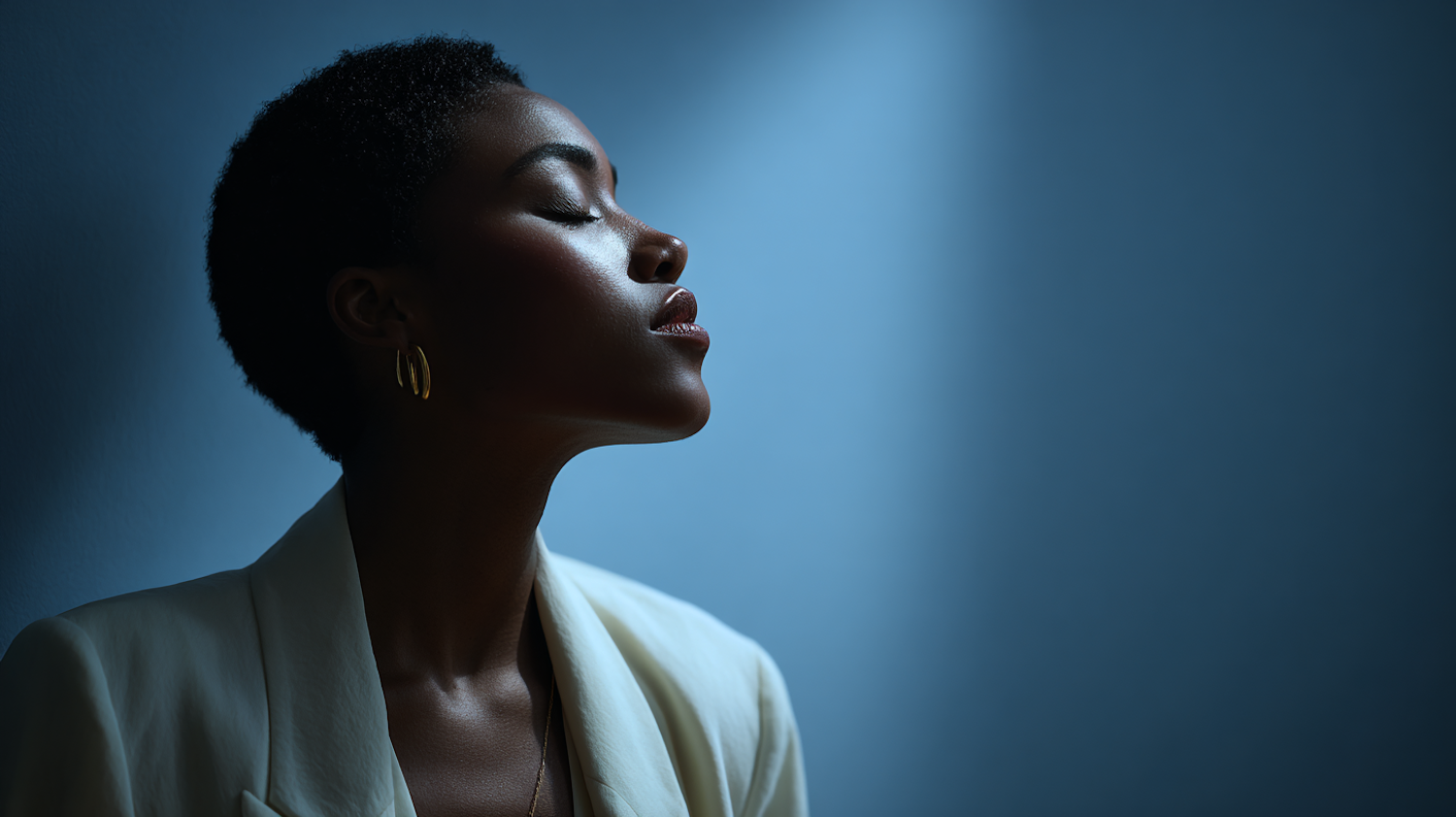 A serene portrait of a person in soft lighting, wearing a light blazer and gold earrings, set against a calming blue background.