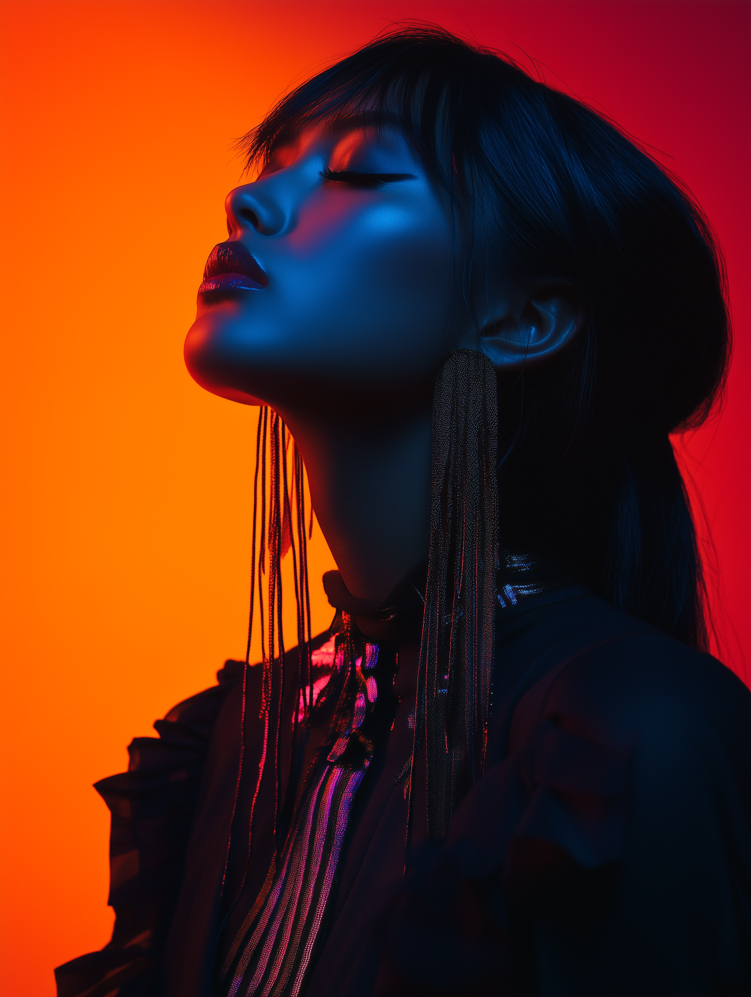 A vibrant portrait of an Asian woman with glowing skin, dramatic earrings, and bold lighting in orange and blue tones.