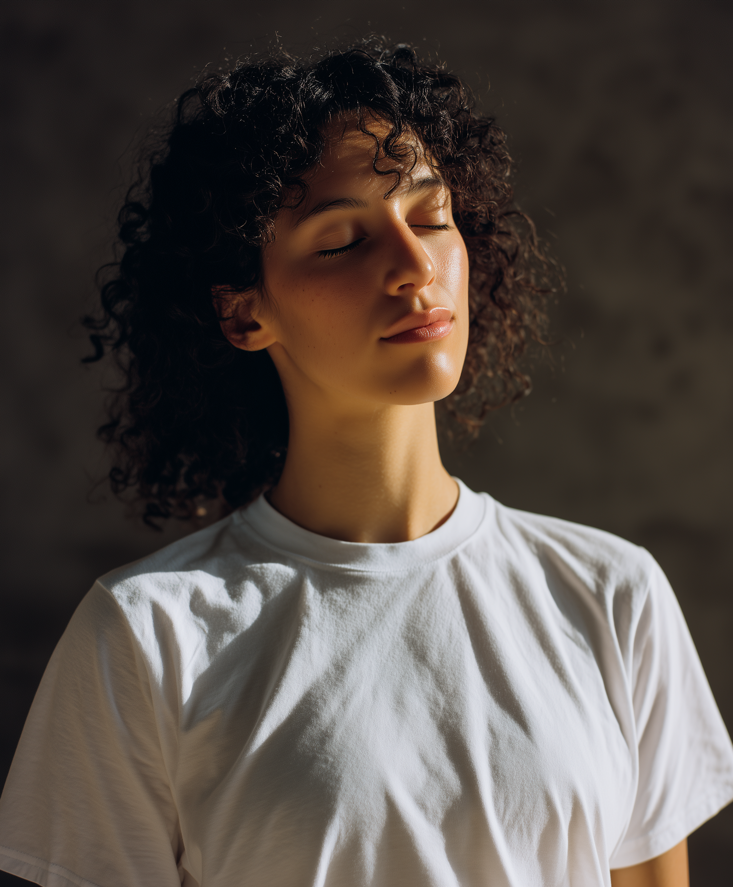 A serene portrait of a young woman with curly hair, eyes closed, in soft sunlight, wearing a white t-shirt against a neutral background.