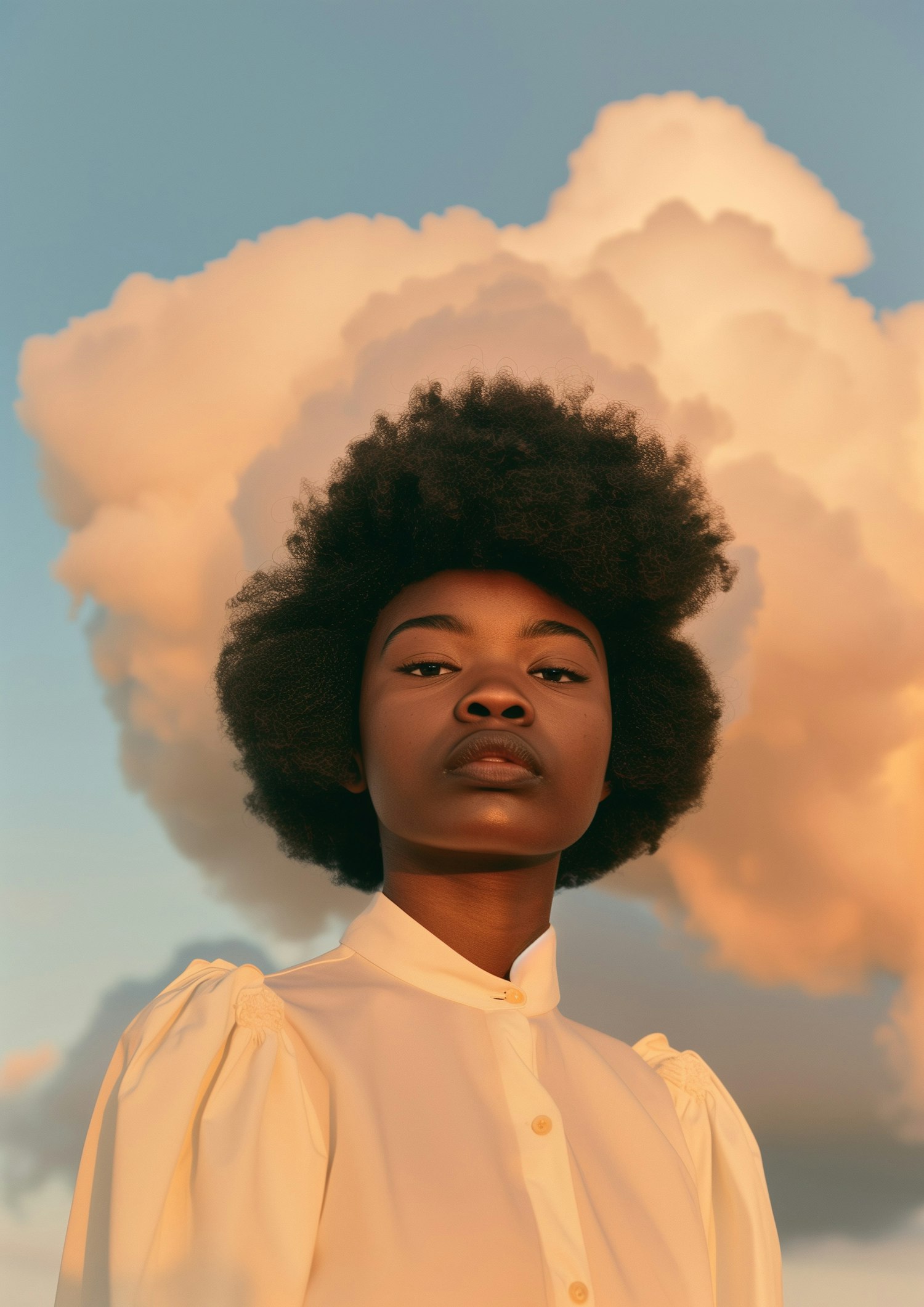 Elegant portrait of a woman with natural afro hair, wearing a cream blouse, set against a golden cloud-filled sky.