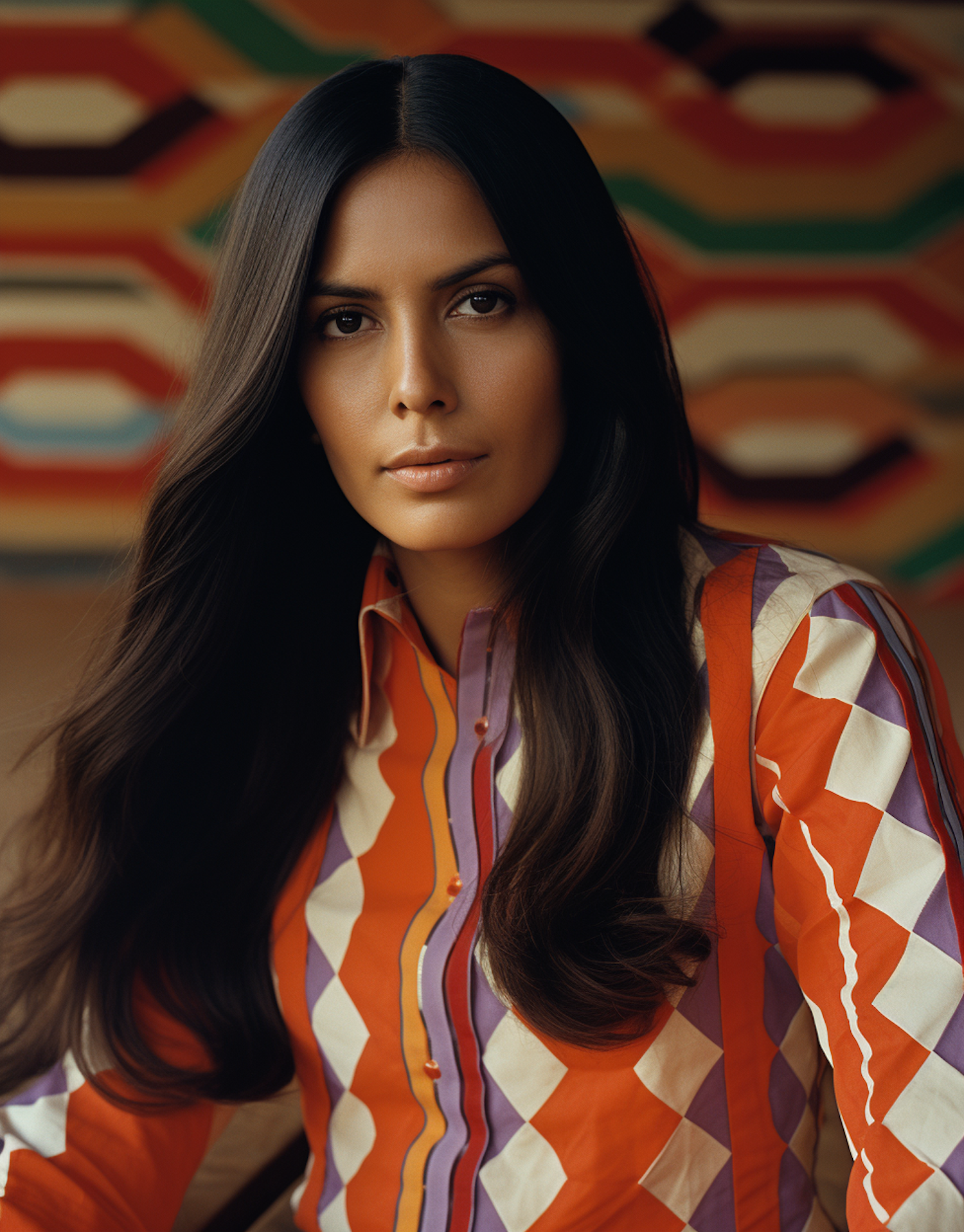 Woman with long dark hair in a vibrant geometric shirt, set against a colorful abstract background.