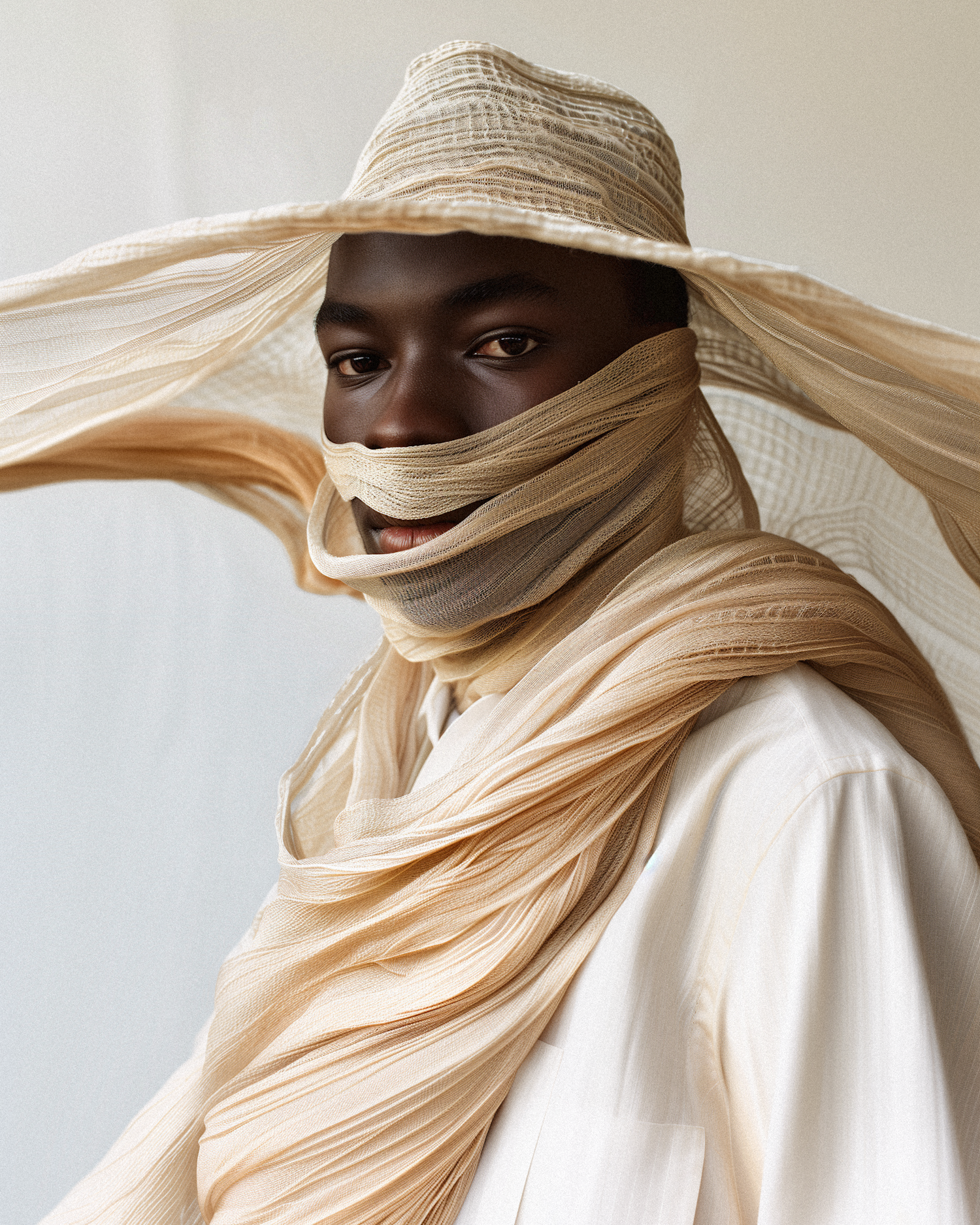 A person wrapped in sheer beige fabric with a wide-brimmed hat, creating an ethereal and artistic look against a neutral background.