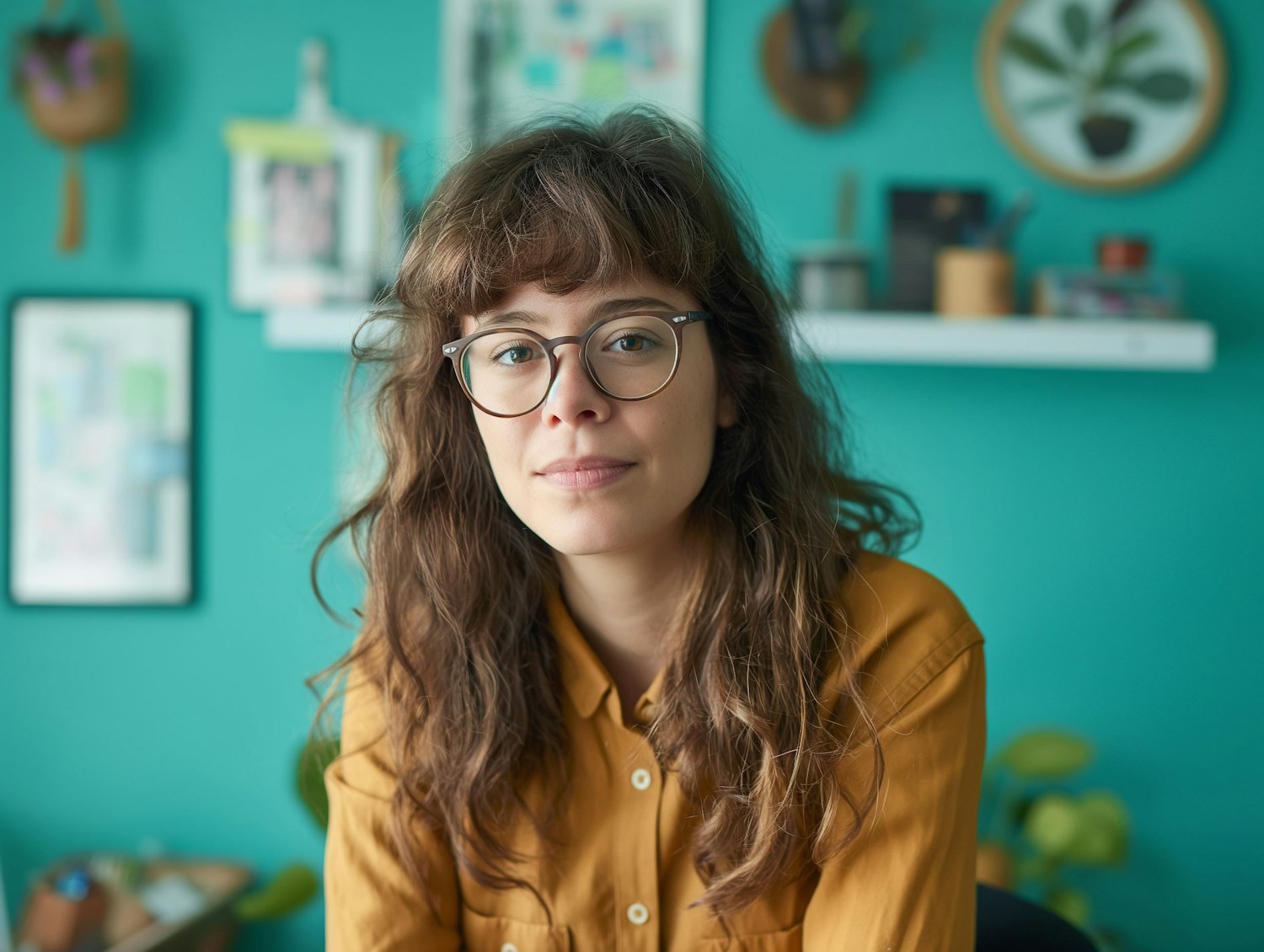 Young woman with glasses and wavy hair in a mustard shirt against a teal wall, surrounded by creative decor.