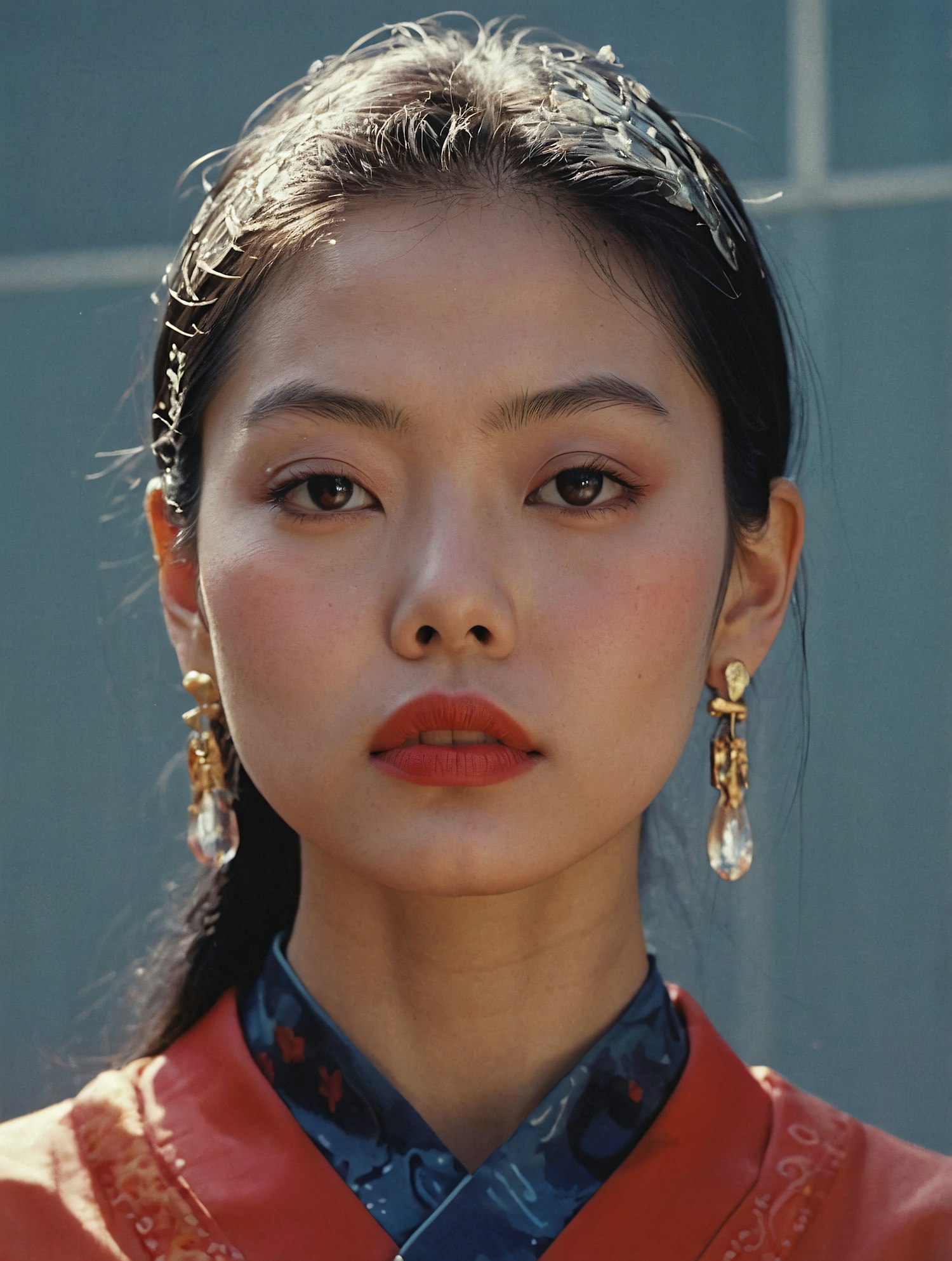 Elegant portrait of an East Asian woman with bold red lipstick, gold earrings, and a traditional red and blue outfit.