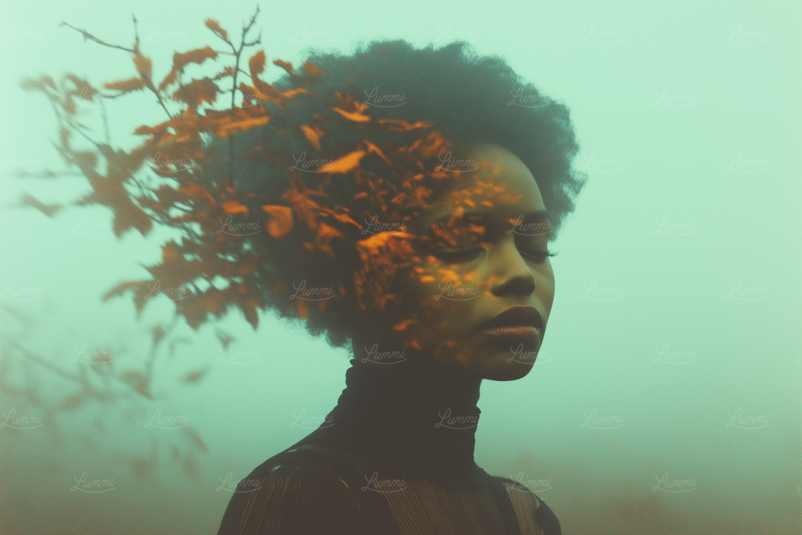 Ethereal portrait of a woman with closed eyes, surrounded by orange leaves, set against a misty green background.