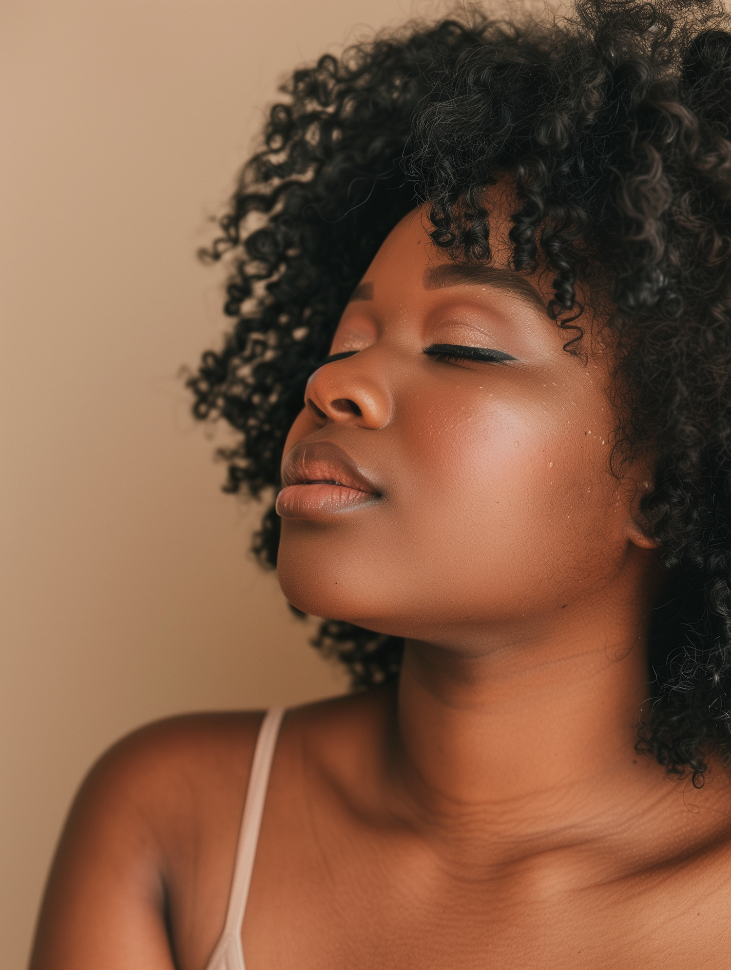 Close-up of a serene Black woman with glowing skin, natural curly hair, and soft makeup against a warm beige background.