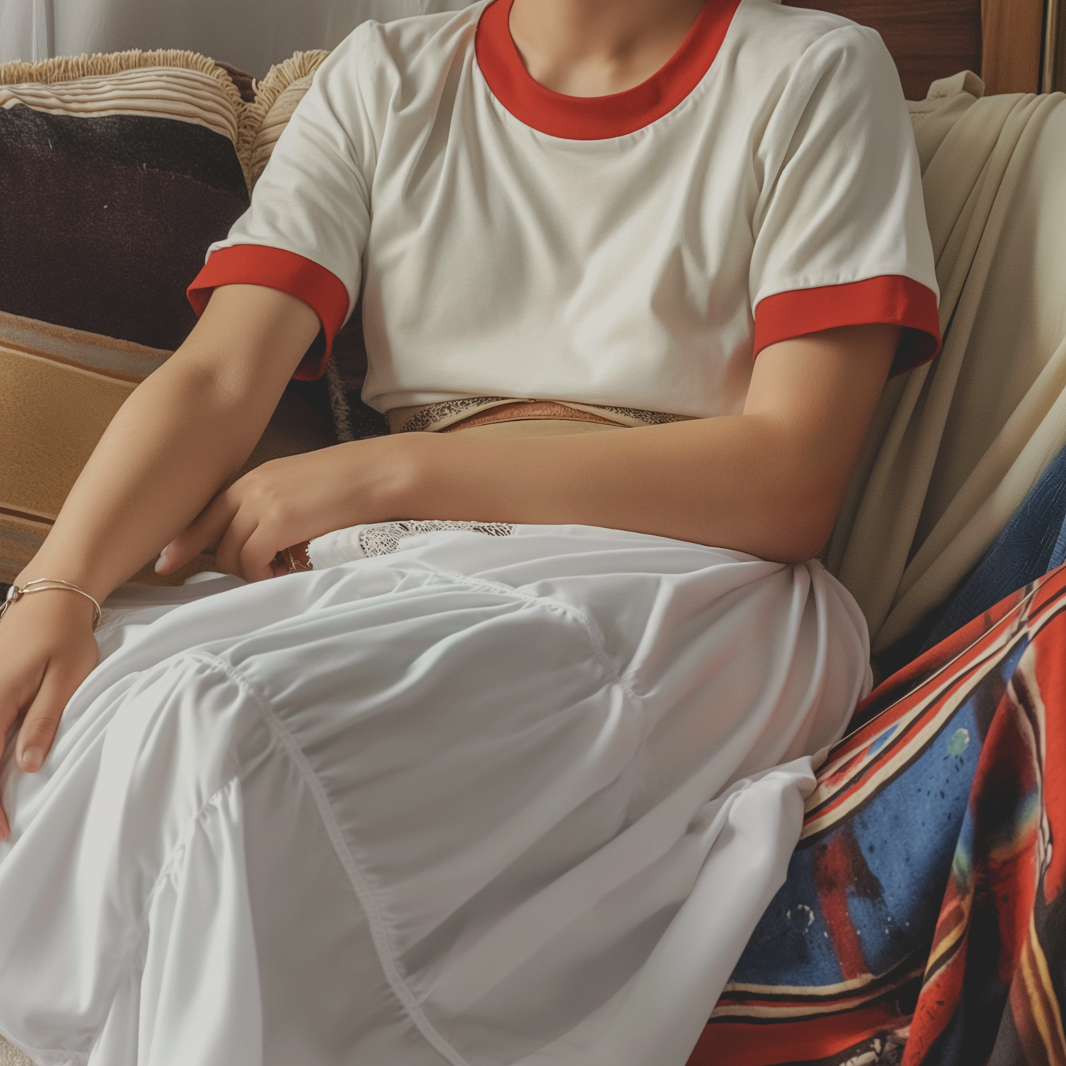 Person in a white t-shirt with red trim, seated on a couch with colorful cushions, creating a cozy and relaxed atmosphere.