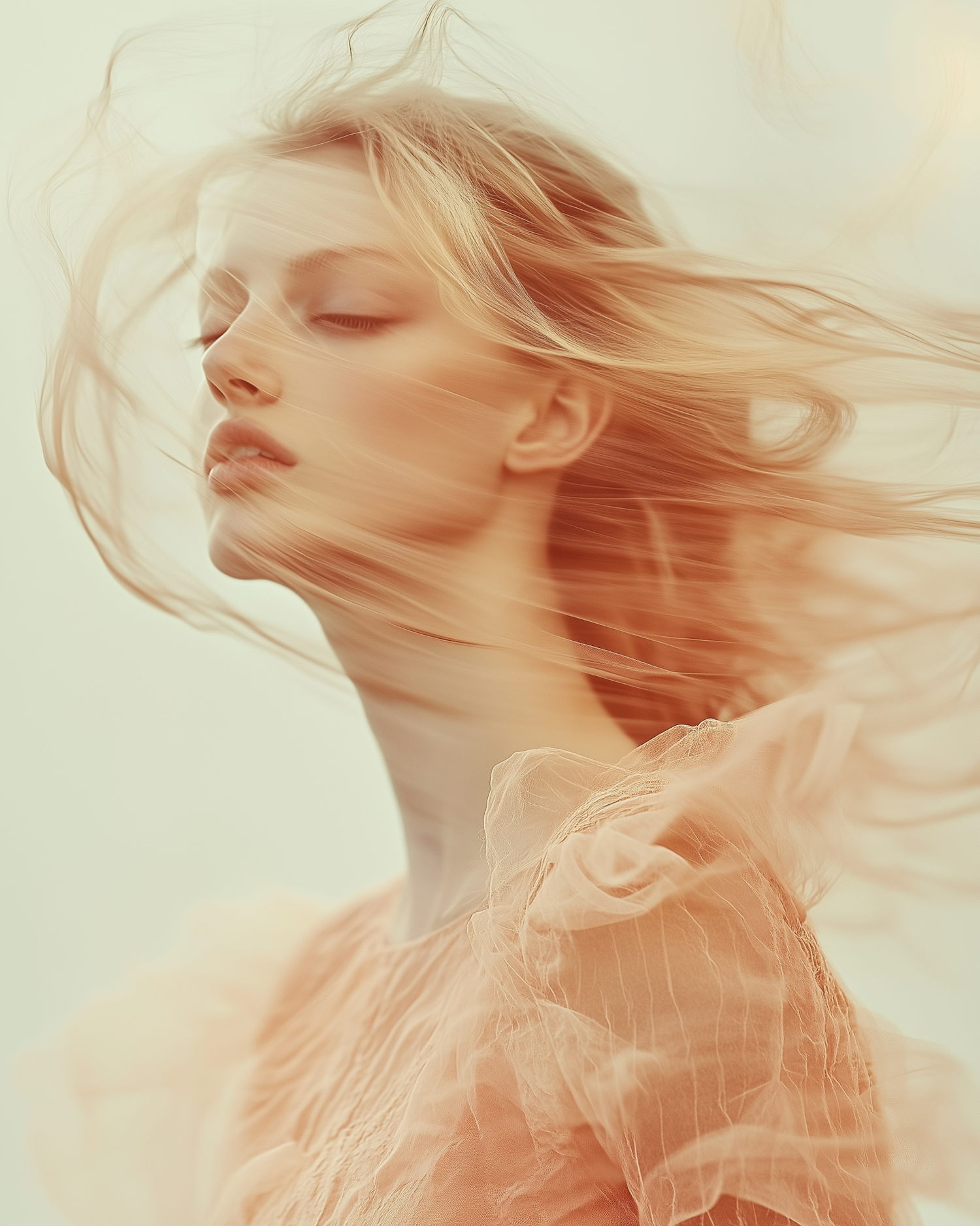 Ethereal portrait of a serene woman with flowing blonde hair and a peach dress, exuding tranquility and grace.