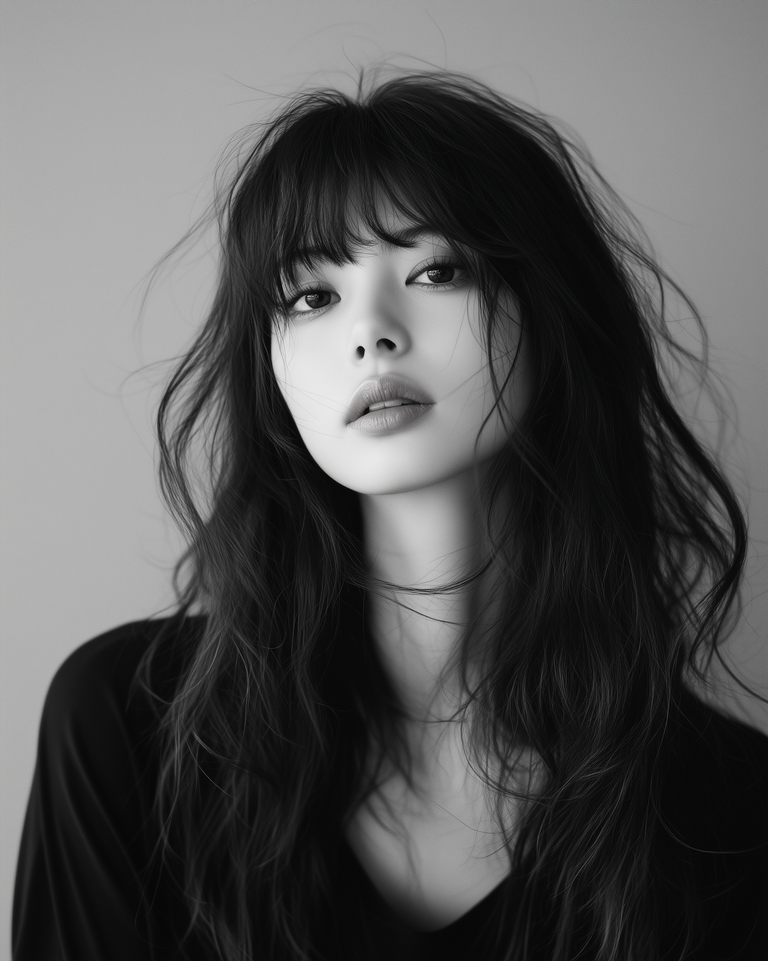 Black and white portrait of a young Asian woman with long wavy hair and serene expression, highlighting her delicate features.