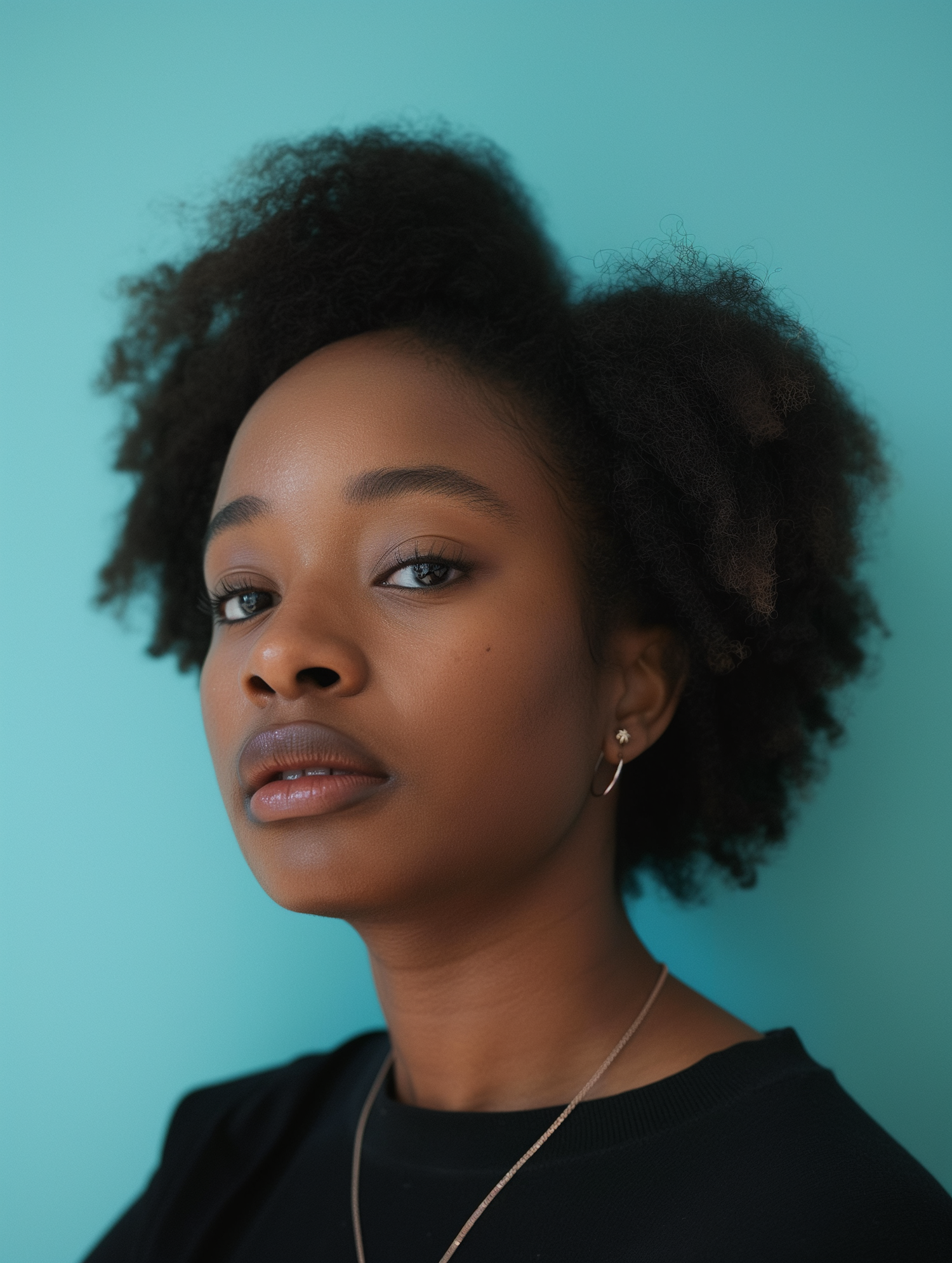 Portrait of a young Black woman with natural afro hair against a turquoise background, wearing a black top and subtle jewelry.