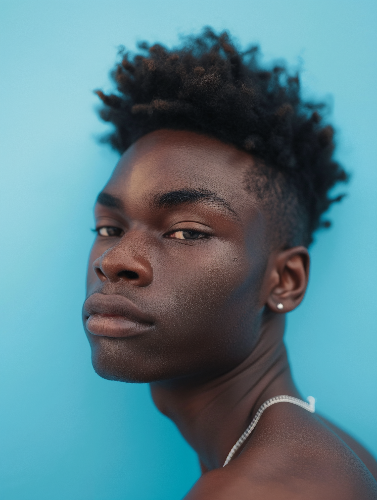 Portrait of a young Black man with curly hair against a bright blue background, wearing a silver chain and earring.