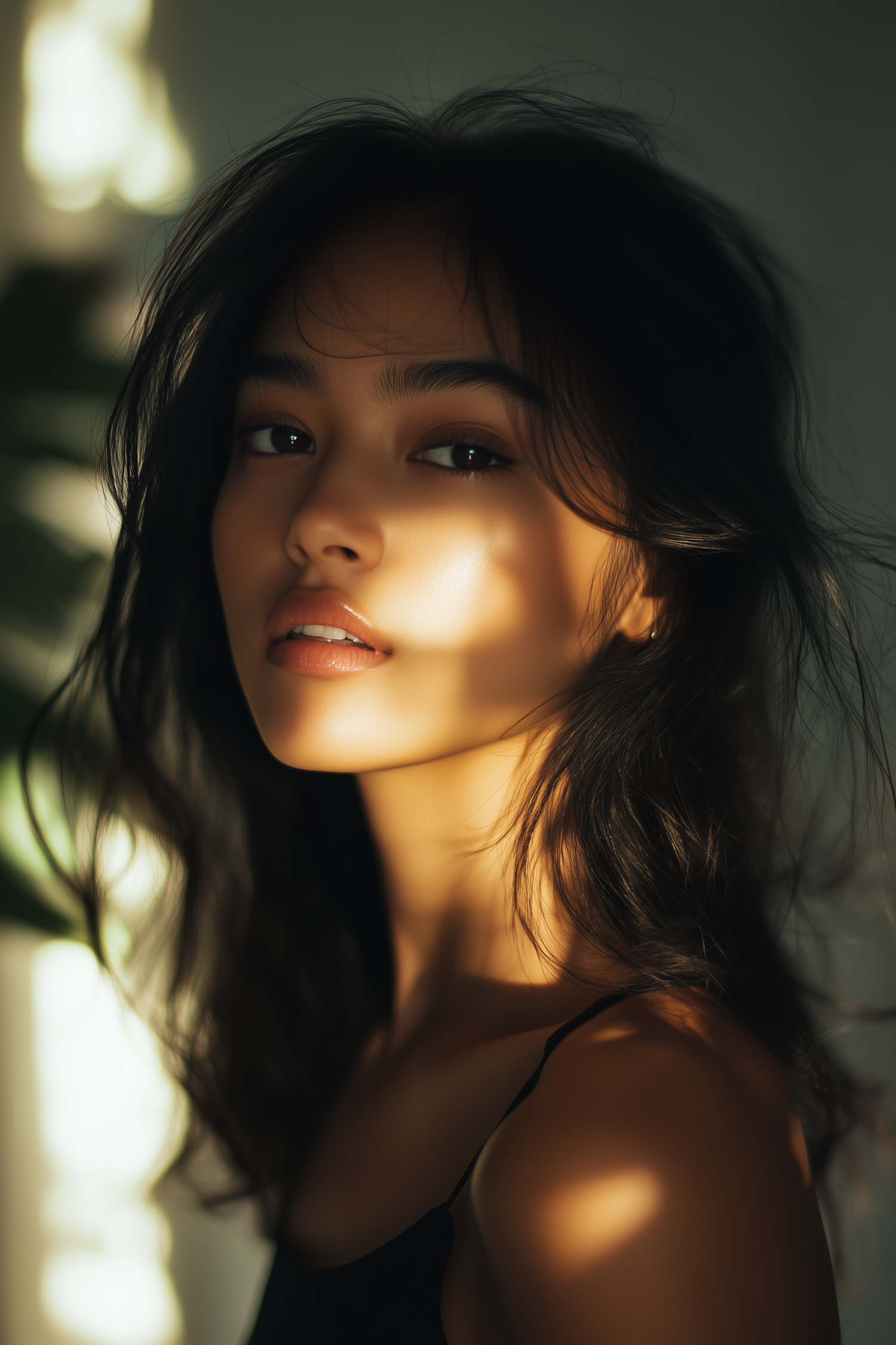 Portrait of a young Asian woman with long dark hair, soft lighting, and a serene expression, creating a warm and intimate atmosphere.