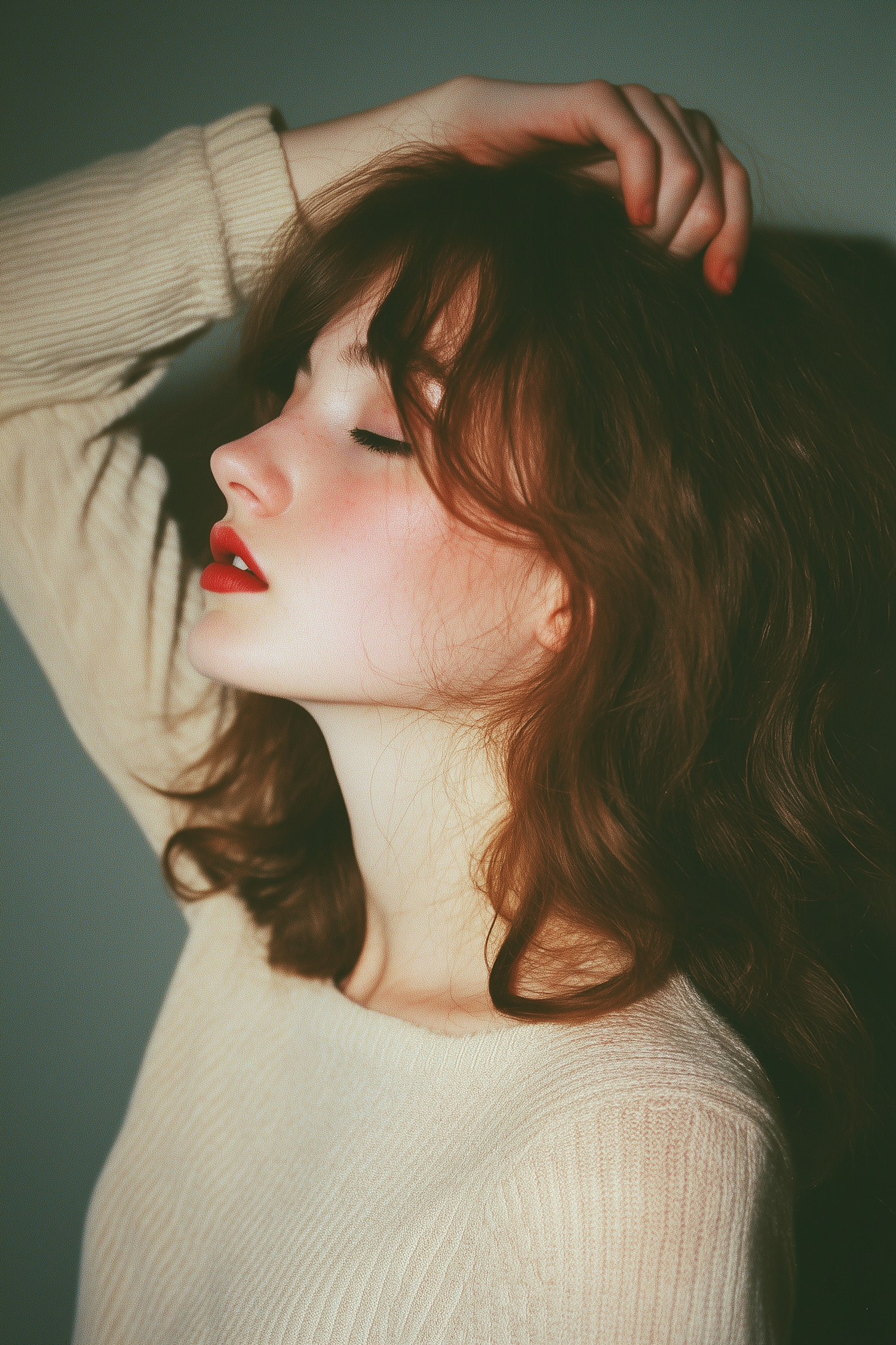 Serene portrait of a young woman with red hair and red lips, eyes closed, wearing a light sweater. Soft lighting enhances her calm expression.