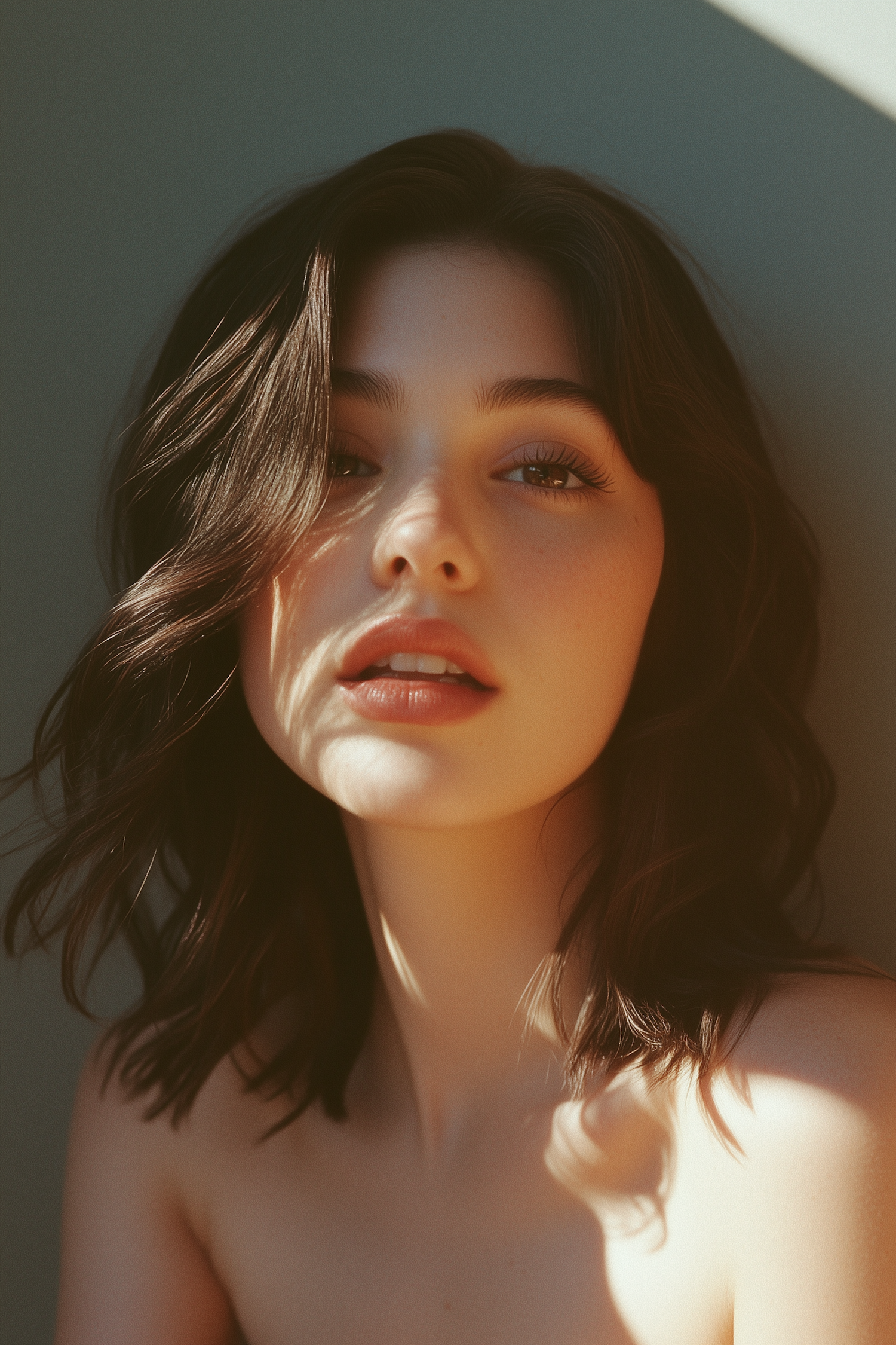 Portrait of a young woman with dark brown hair and fair skin, softly lit against a muted green background, exuding warmth and serenity.