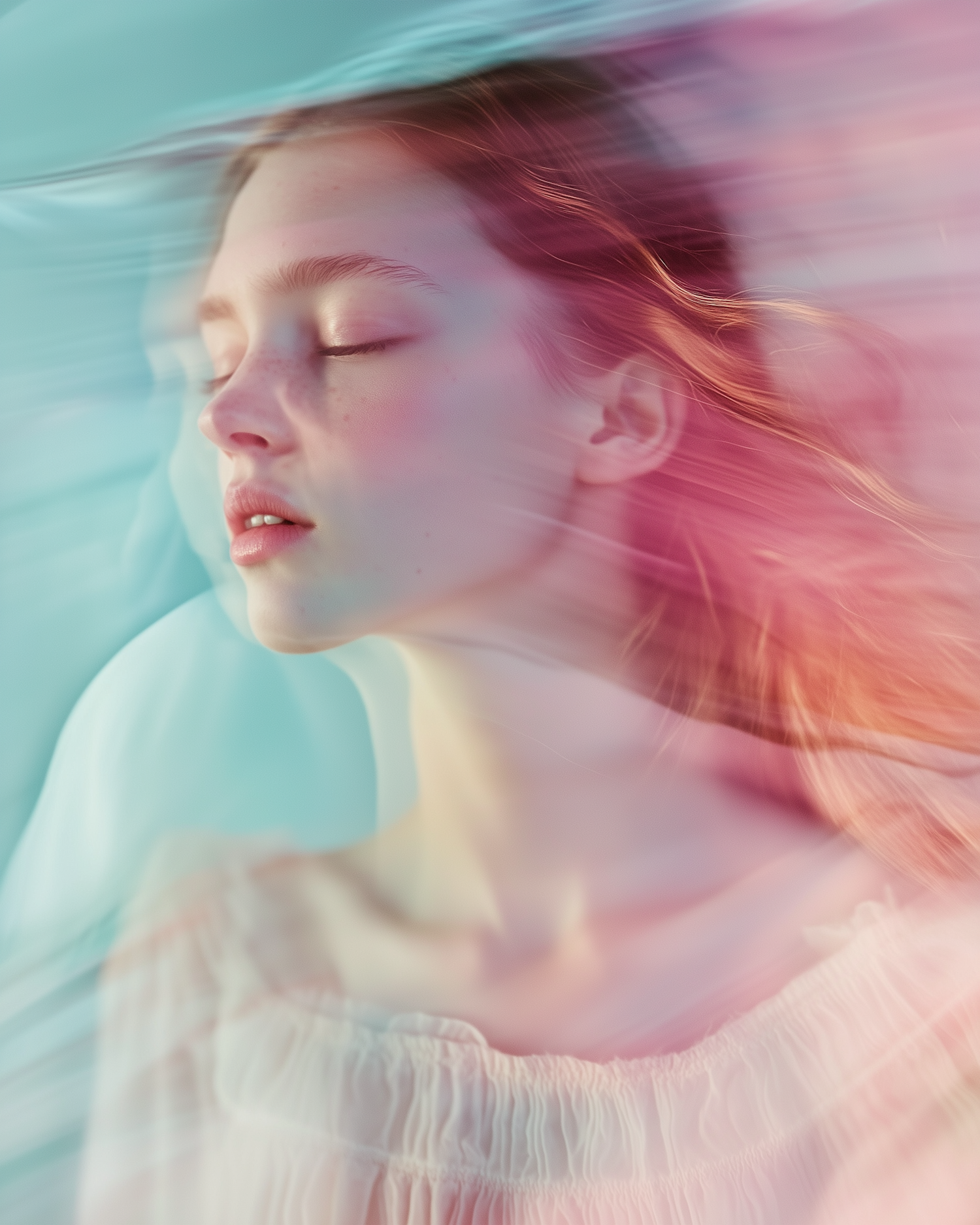 A serene portrait of a young woman with closed eyes, surrounded by soft pastel colors, creating a dreamy and ethereal atmosphere.