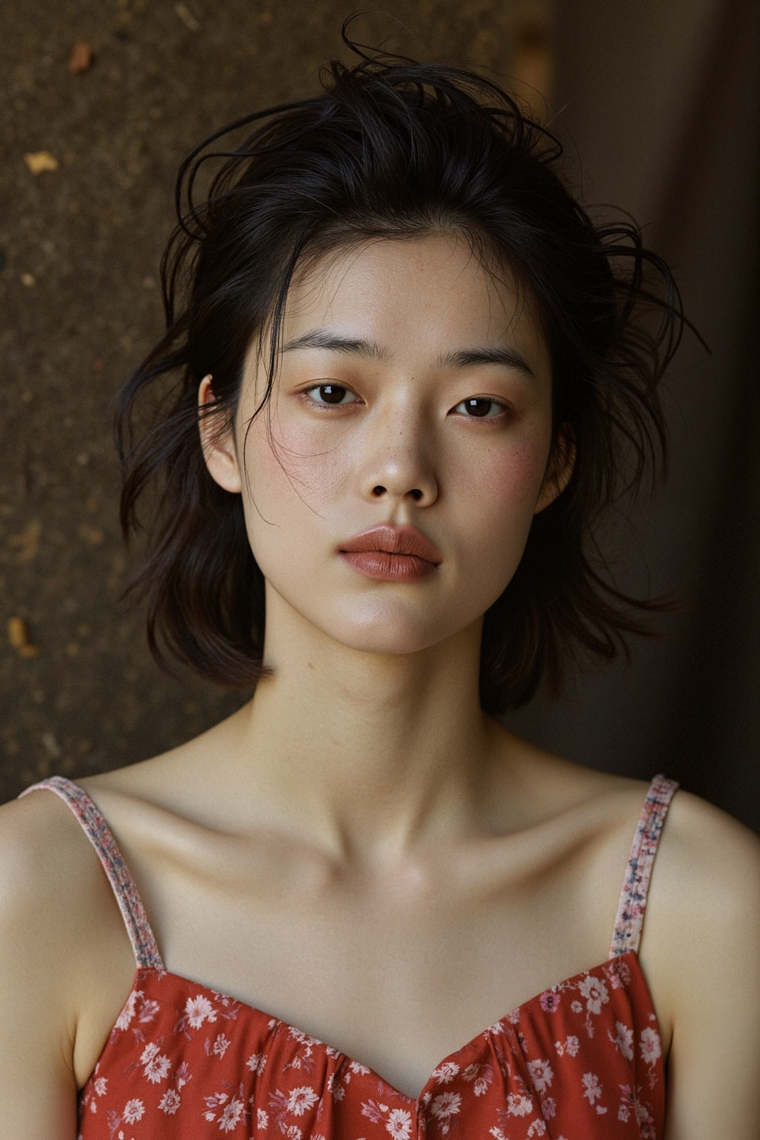 Portrait of a young Asian woman with short black hair, wearing a red floral dress, gazing calmly at the camera in soft lighting.