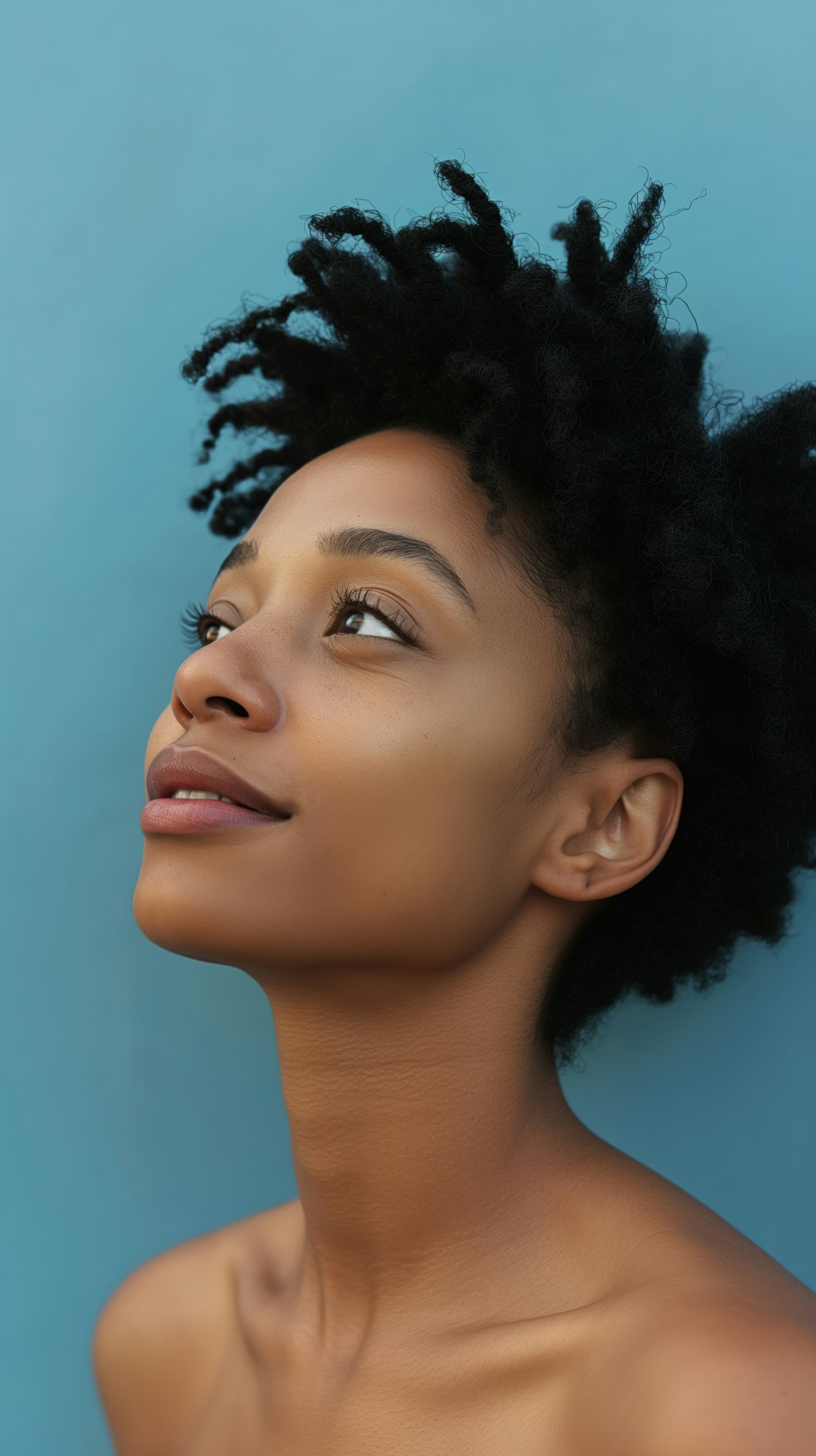Portrait of a young Black woman with natural afro hair, gazing upwards against a soft blue background, exuding serenity and elegance.