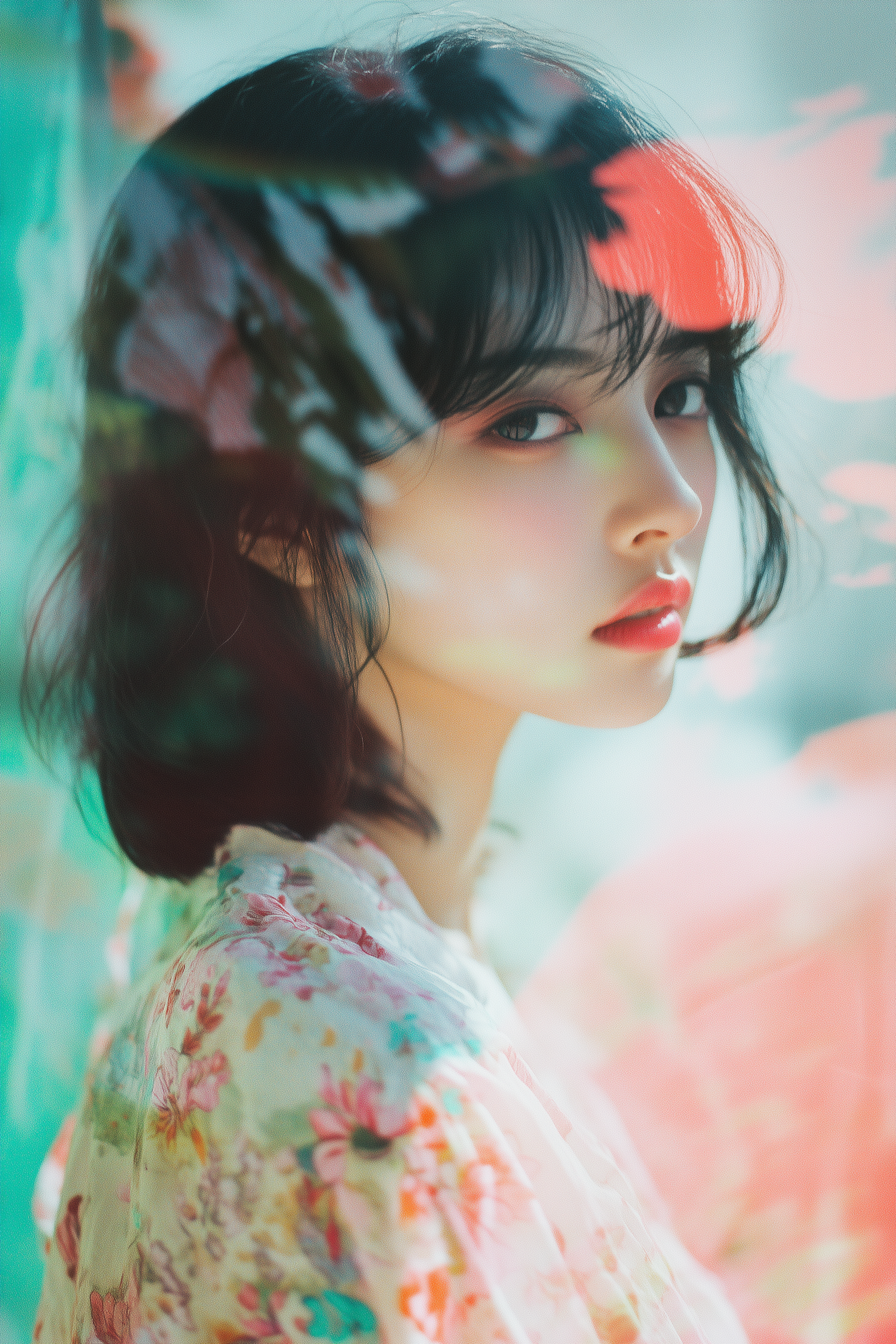 Ethereal portrait of a young woman in floral attire, with soft lighting and dreamy pastel hues in the background.