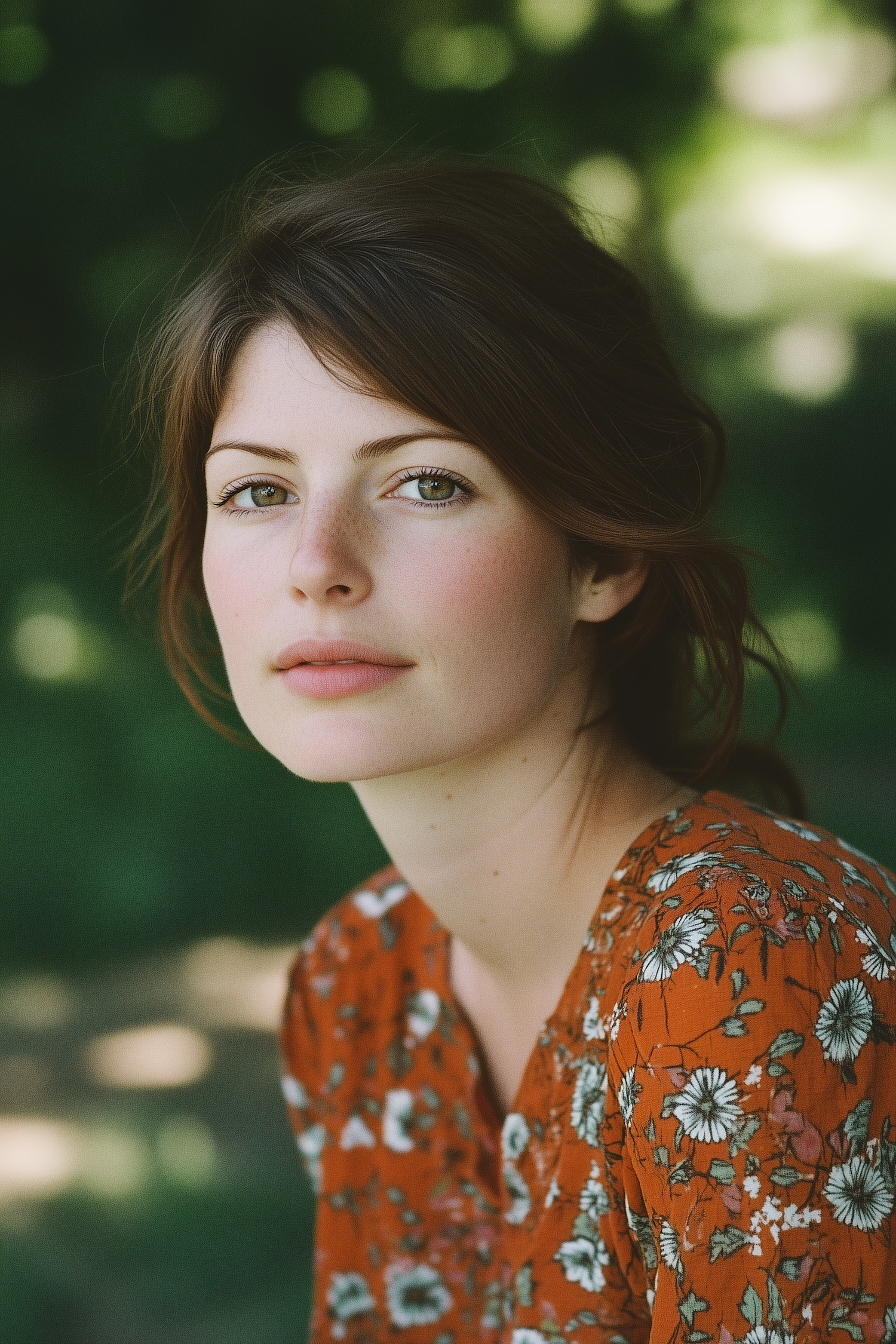Portrait of a young woman with light brown hair and green eyes, wearing a floral blouse in a serene outdoor setting.