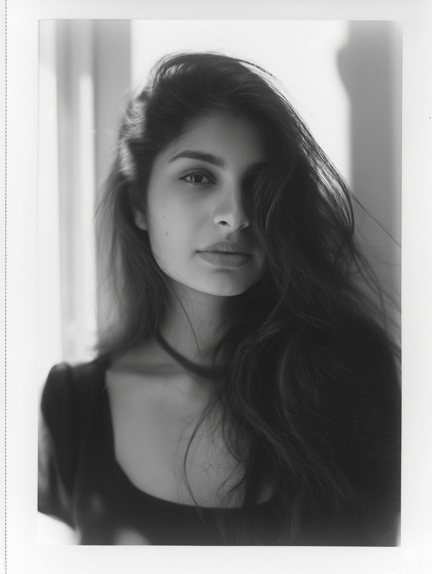 Black and white portrait of a young woman with long dark hair and serene expression, softly lit with gentle shadows.