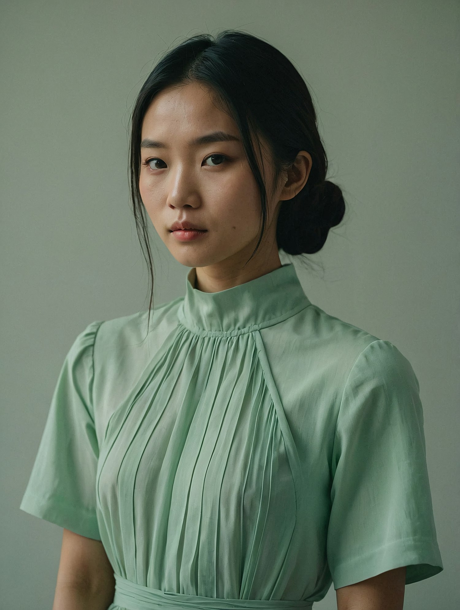 Elegant portrait of an Asian woman in a light green pleated dress, with a serene expression and soft lighting.
