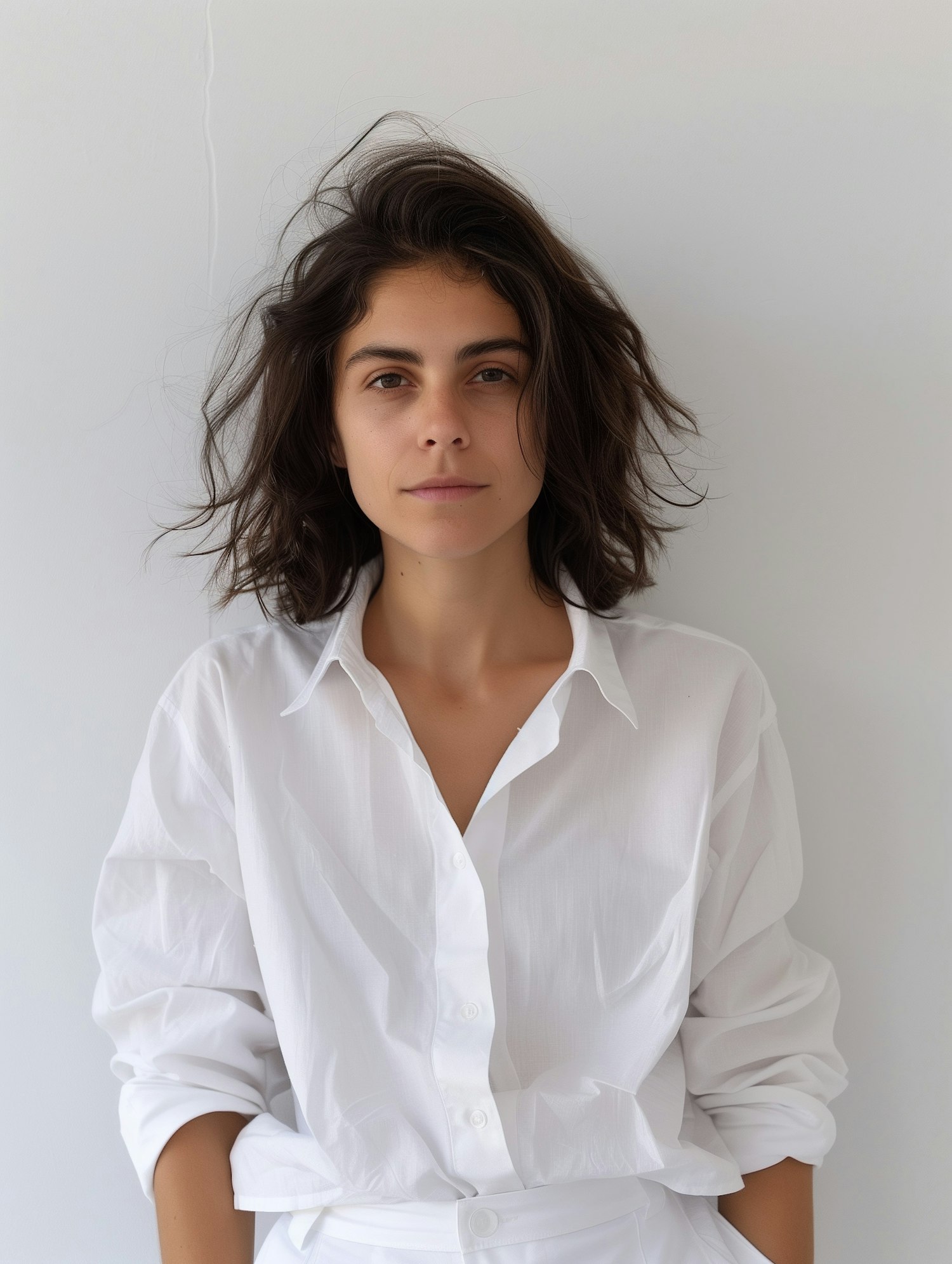 Woman with dark hair in a white shirt against a plain background, exuding a casual and polished look.