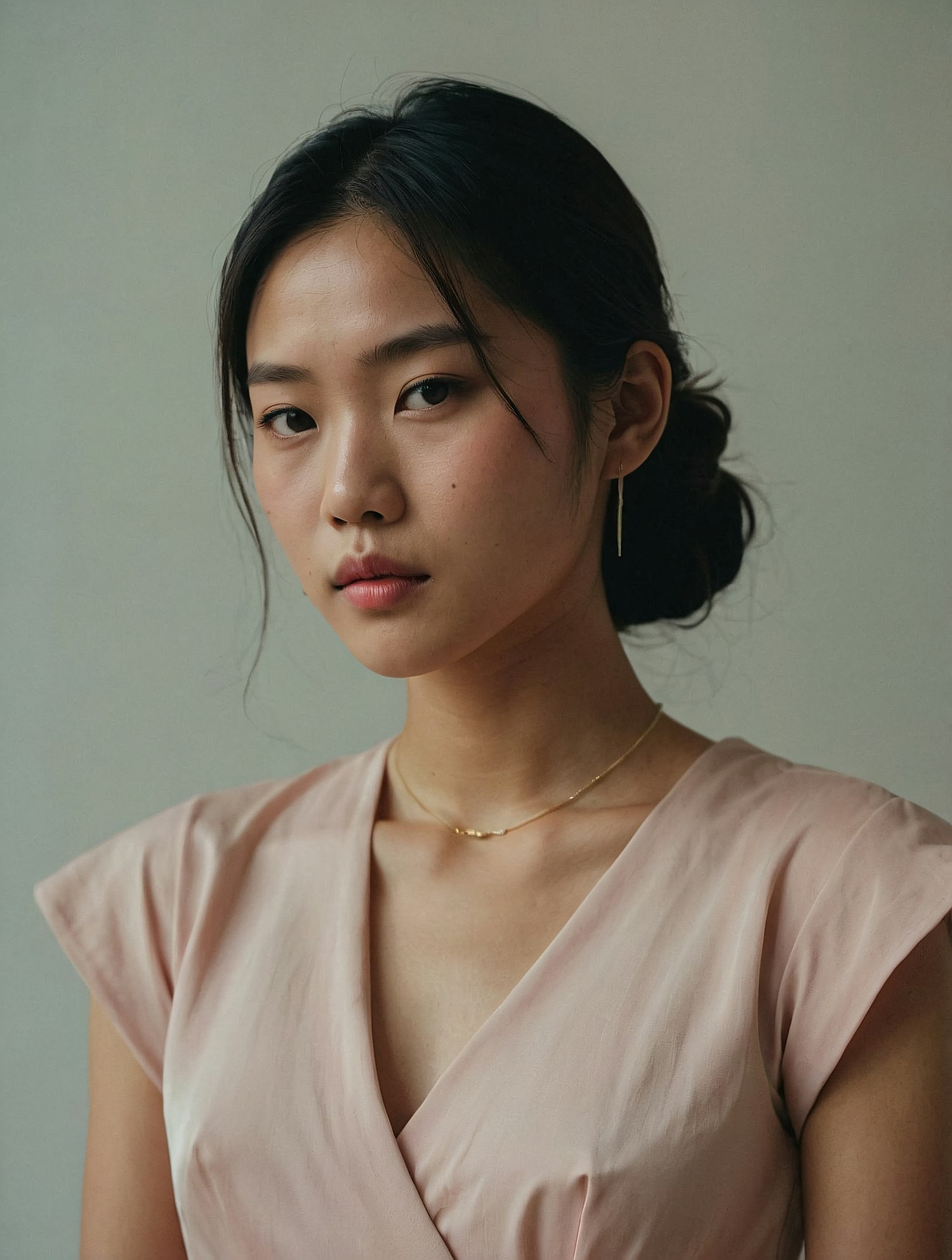 Portrait of an Asian woman with dark hair in a bun, wearing a pink dress and gold jewelry, set against a neutral background.