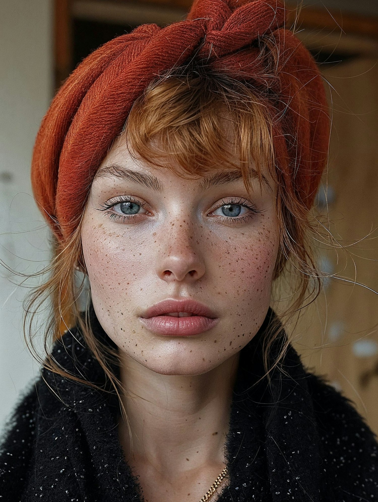 Portrait of a young woman with auburn hair and freckles, wearing a burnt orange headscarf and black speckled fabric, gazing intently.