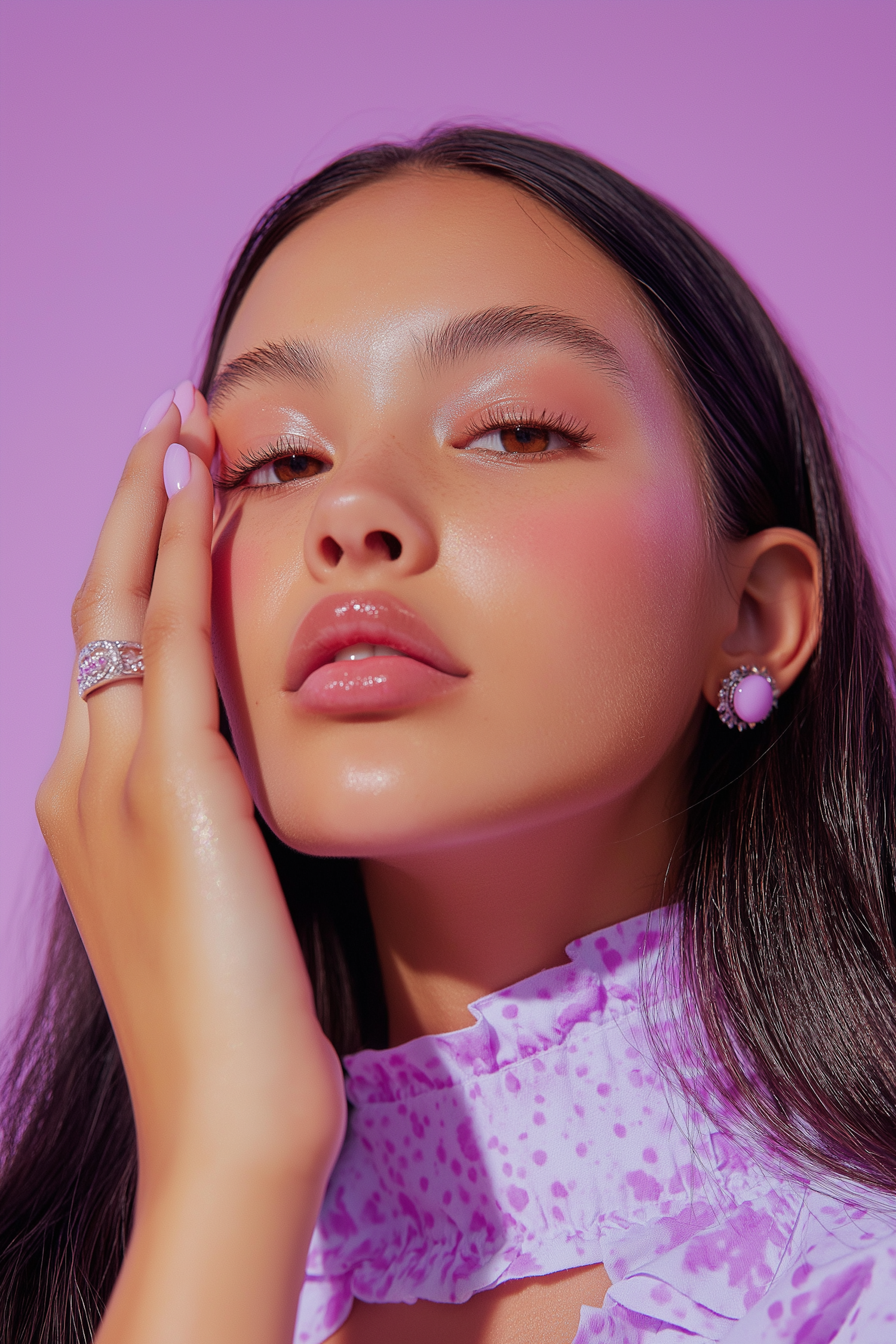 Young woman with glossy lips and pastel pink nails against a lavender background, wearing a purple blouse and sparkling jewelry.
