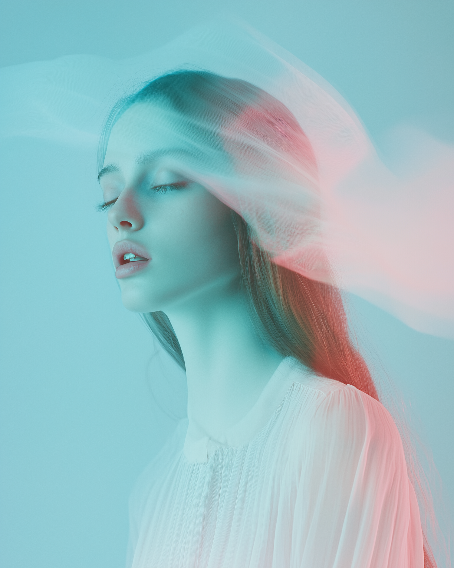 Ethereal portrait of a serene woman with closed eyes, surrounded by soft turquoise and pink hues, creating a dreamlike atmosphere.