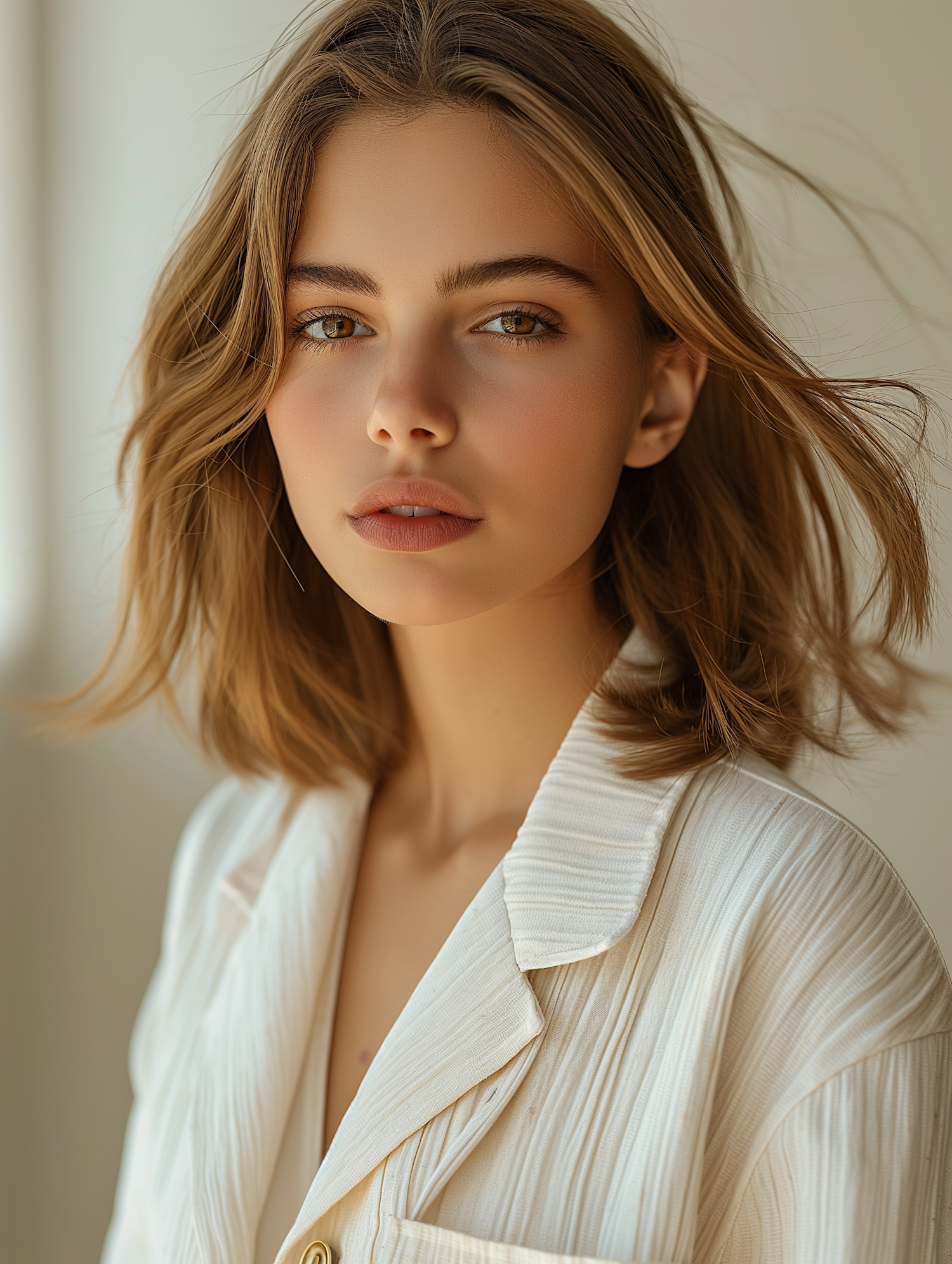 Portrait of a young woman with light brown hair, hazel eyes, and natural makeup, wearing a white blouse in soft, warm lighting.