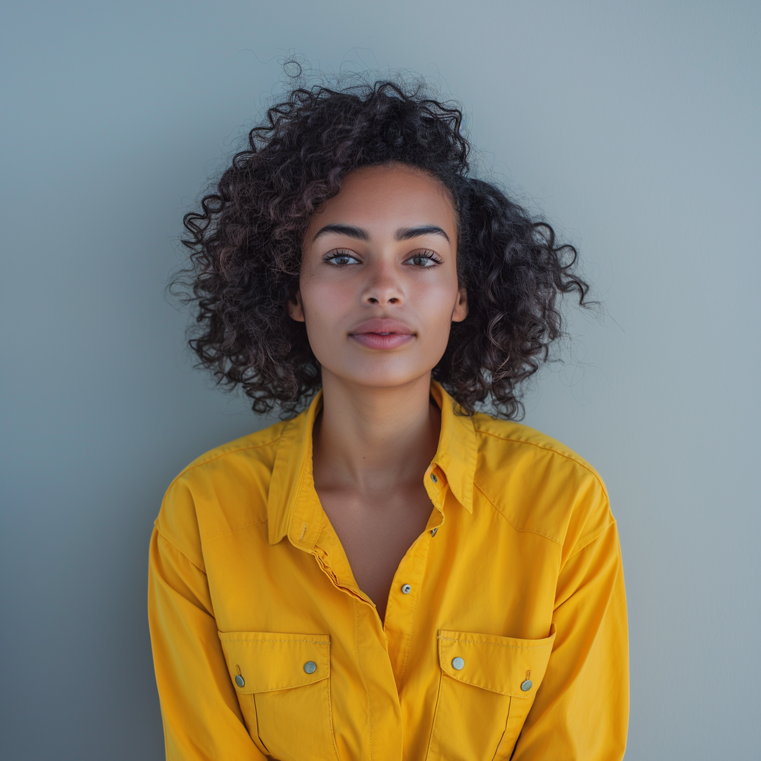 Young woman with curly hair in a yellow shirt against a gray background, exuding calm and confidence.