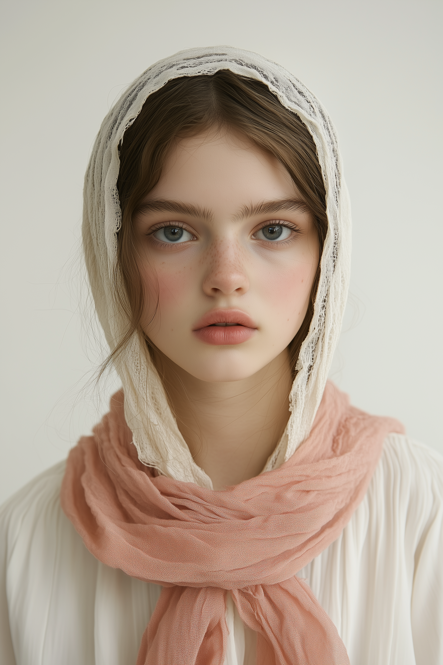 Serene portrait of a young woman with blue eyes, wearing a lace headscarf and pink scarf, against a light background.