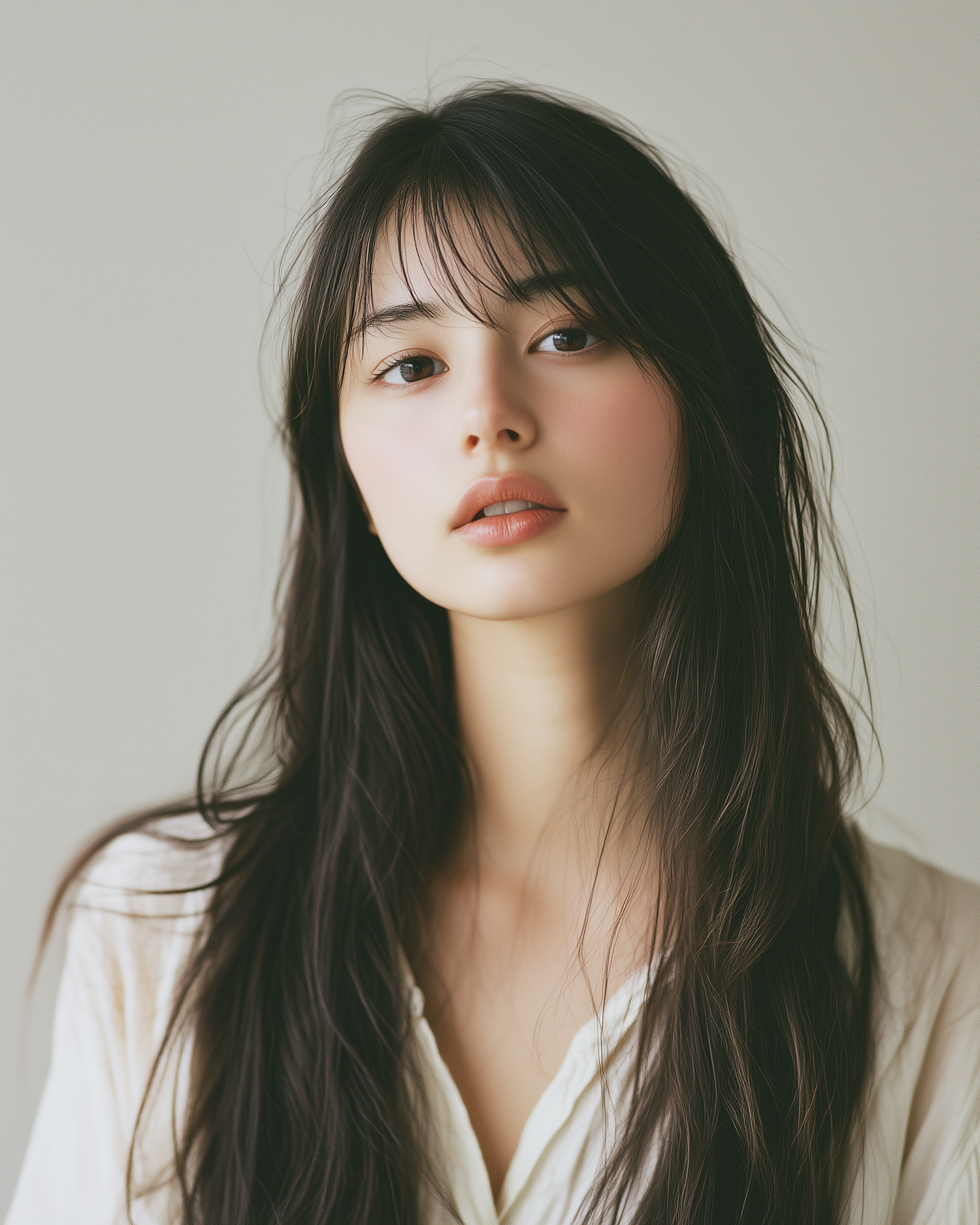 Portrait of a young Asian woman with long dark hair and serene expression, wearing a light blouse against a neutral background.
