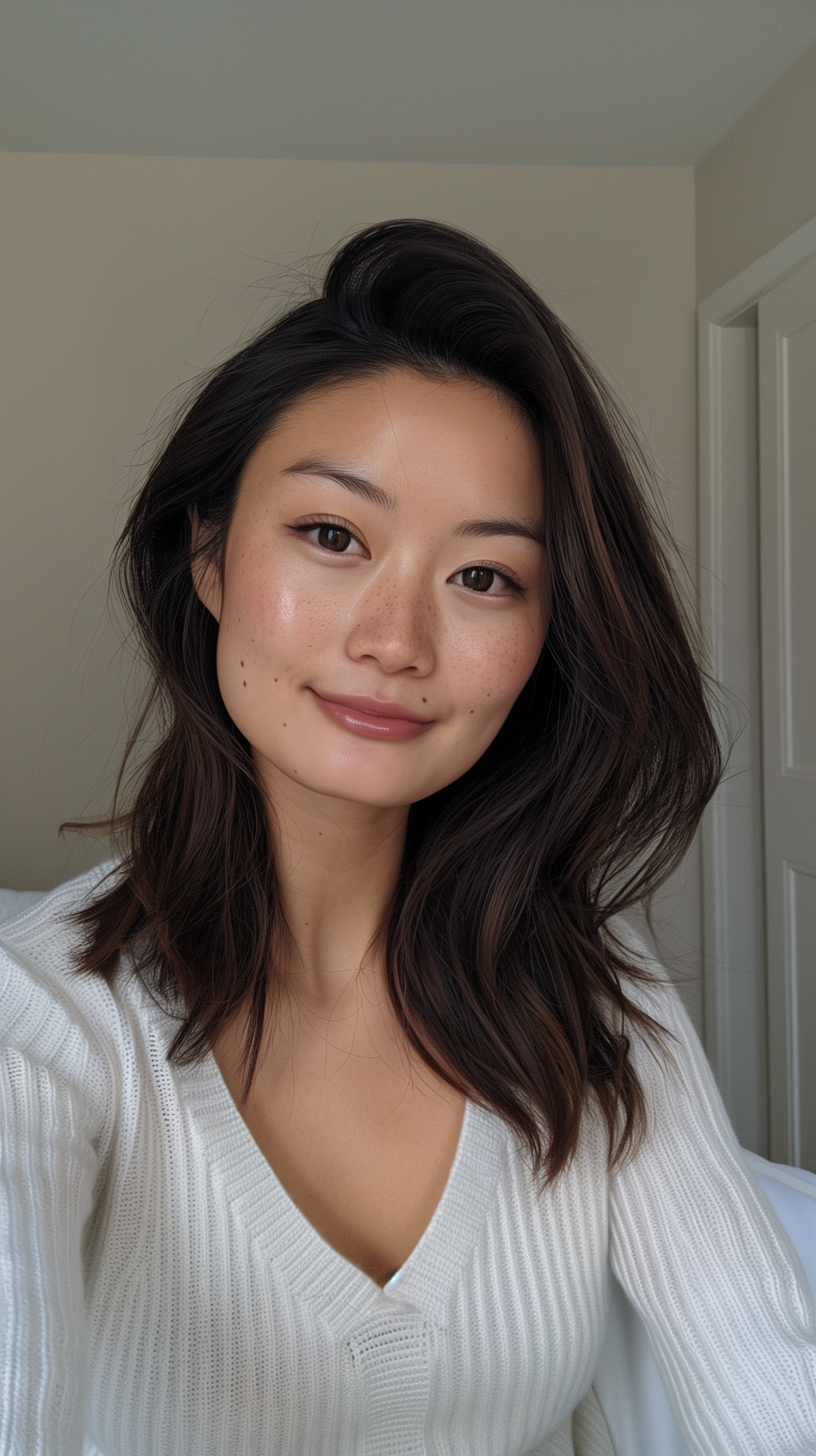 Asian woman with dark brown hair and freckles, wearing a white sweater, smiles gently against a neutral background.
