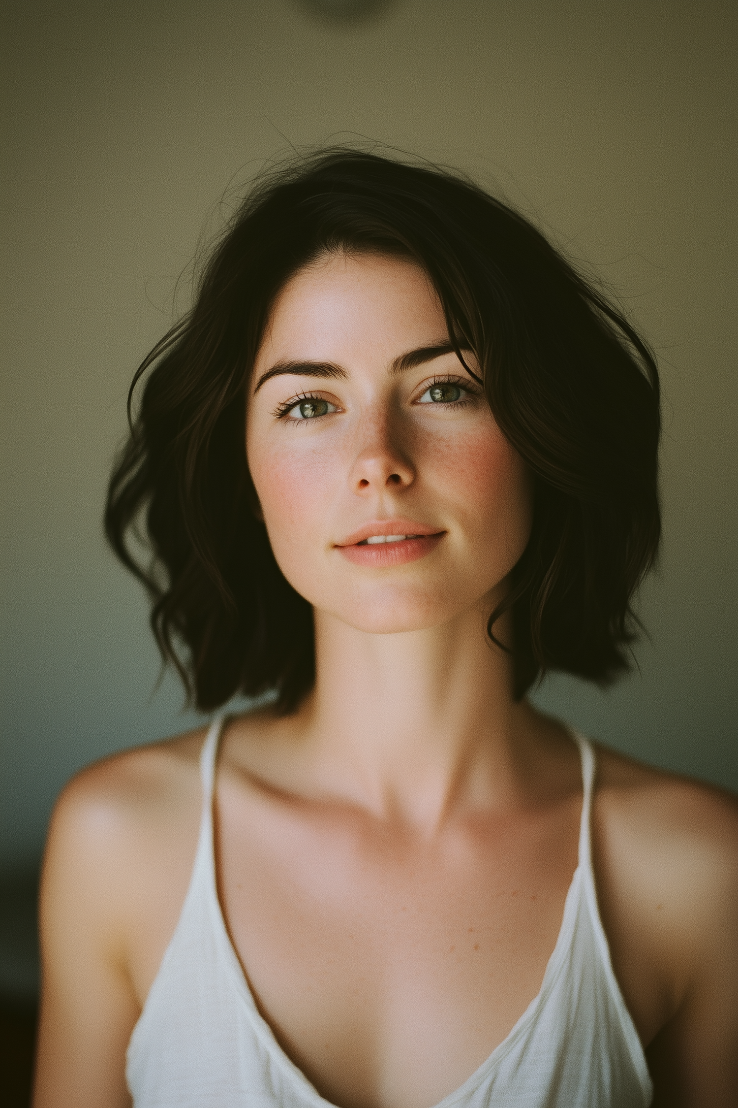 Portrait of a young woman with short black hair and green eyes, wearing a white top. Soft lighting enhances her serene expression.