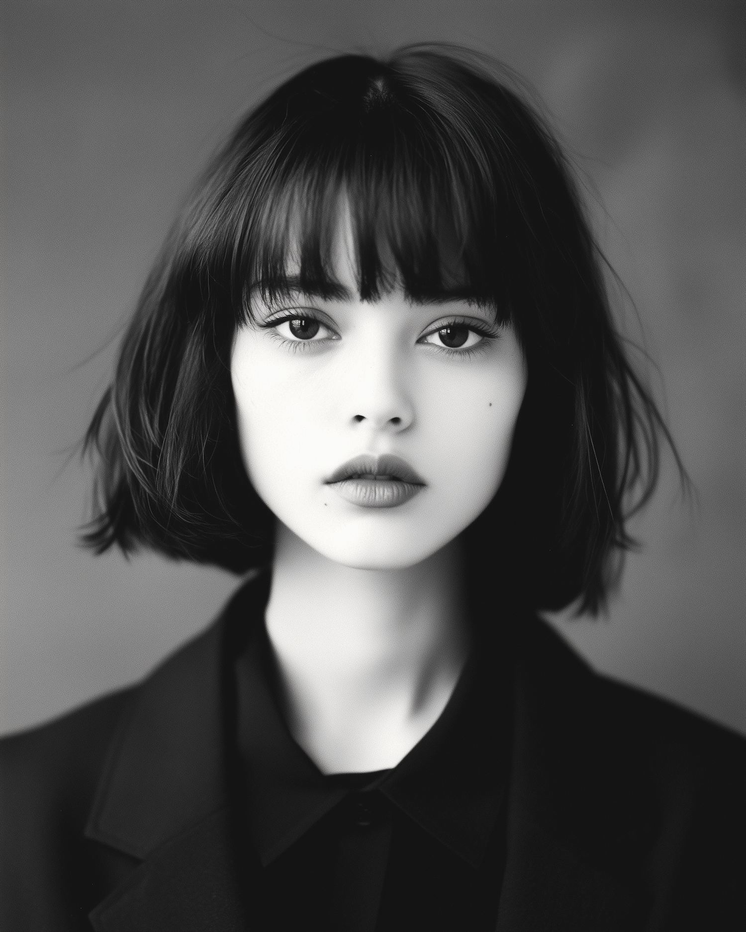 Portrait of a young Asian woman with short dark hair and bangs, wearing a dark jacket. Her calm expression and direct gaze captivate.