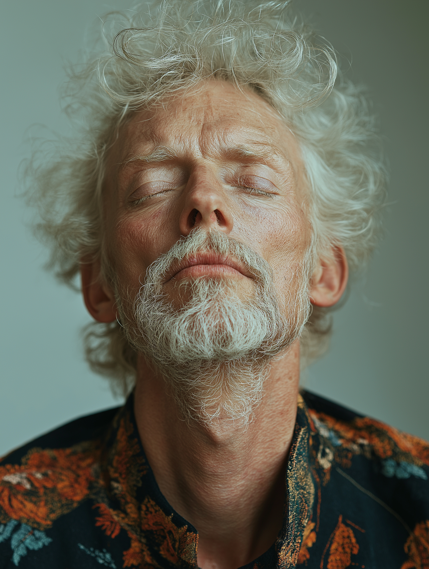 Close-up portrait of a serene Caucasian man with white hair and beard, eyes closed, wearing a floral-patterned shirt.