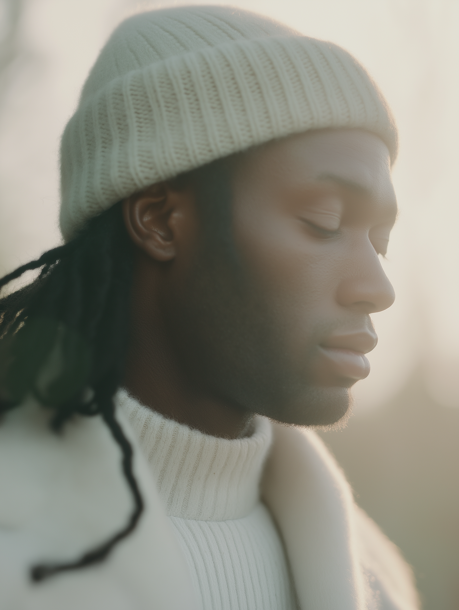Peaceful portrait of a man in a cream beanie and sweater, bathed in warm golden light with a serene, introspective expression.