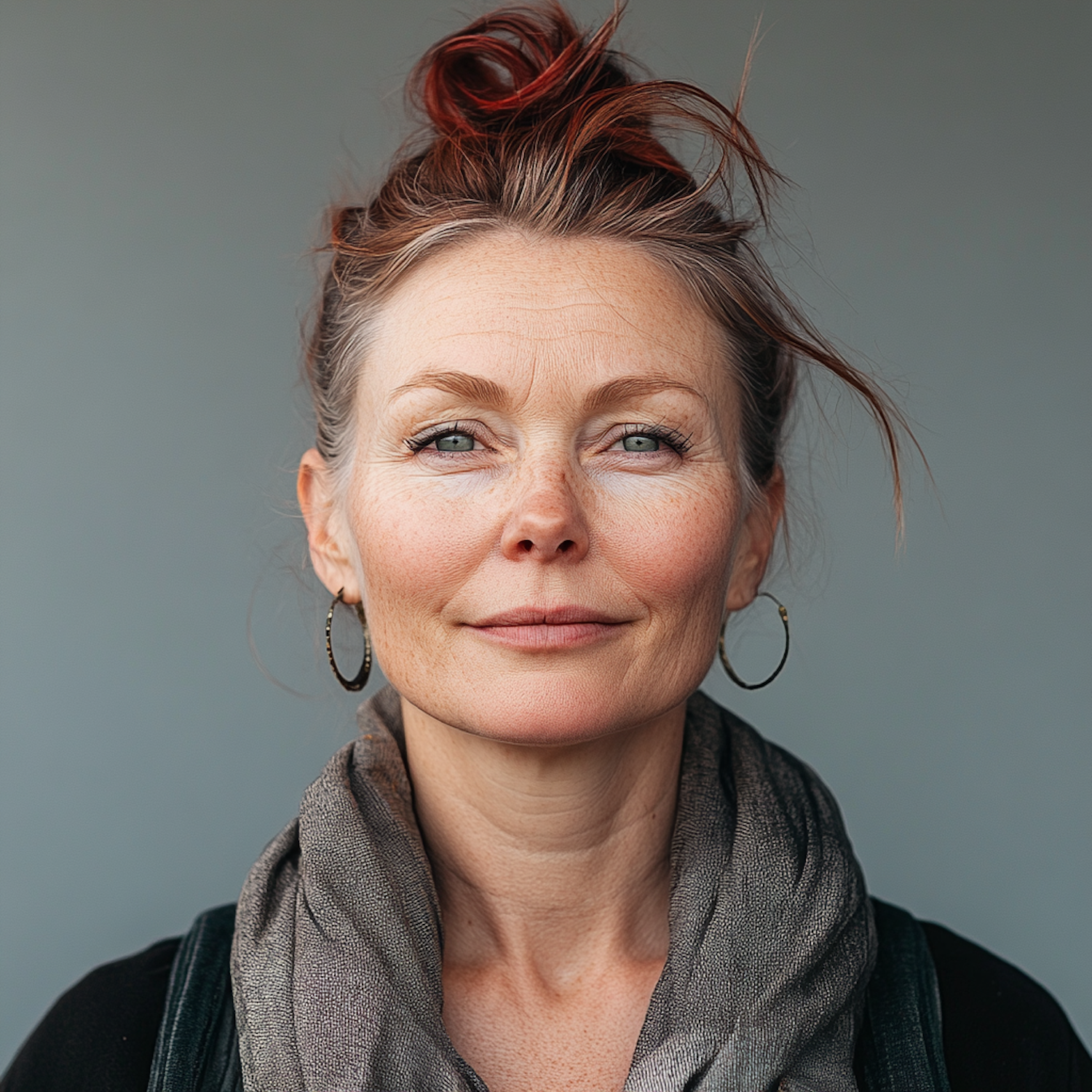Portrait of a middle-aged woman with auburn hair, hoop earrings, and a gray scarf, exuding confidence and calmness against a gray background.