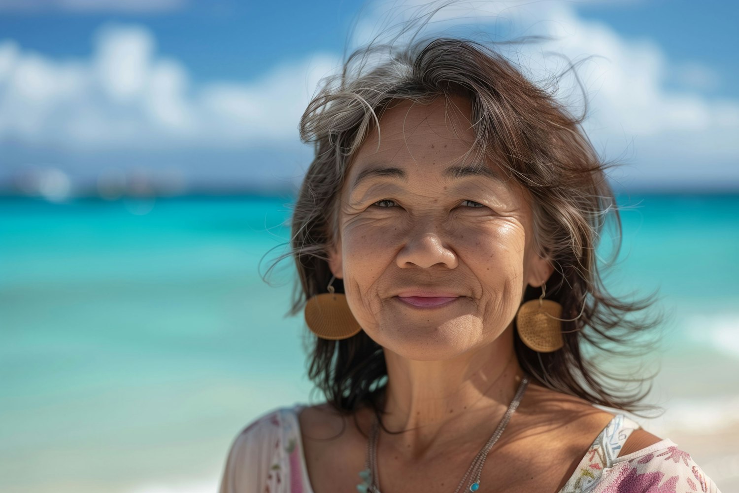 Asian woman with gray-streaked hair and golden earrings on a sunny beach, turquoise waters in the background.