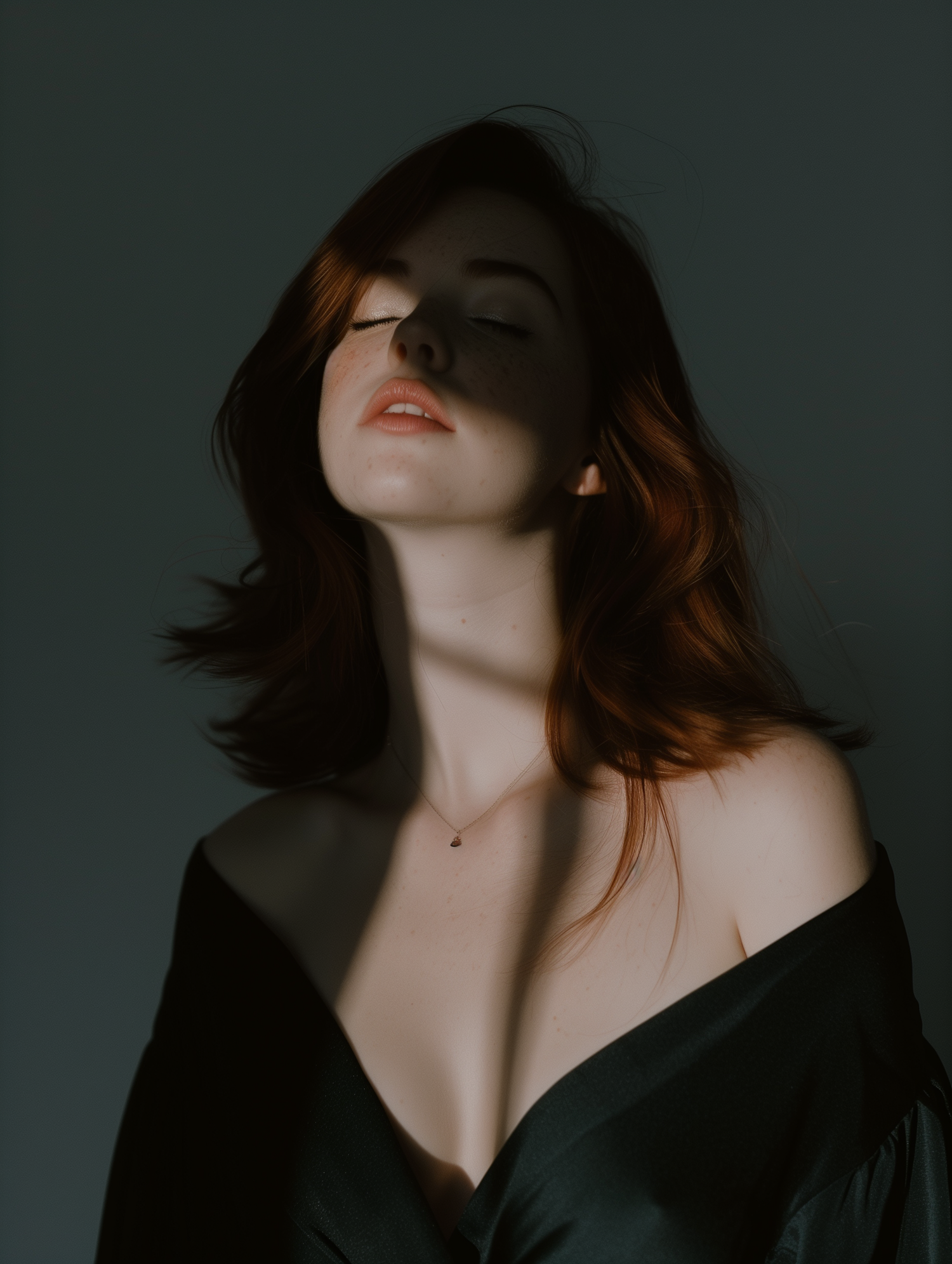 Serene portrait of a young woman with auburn hair and freckles, eyes closed, in dramatic lighting and a dark off-shoulder top.
