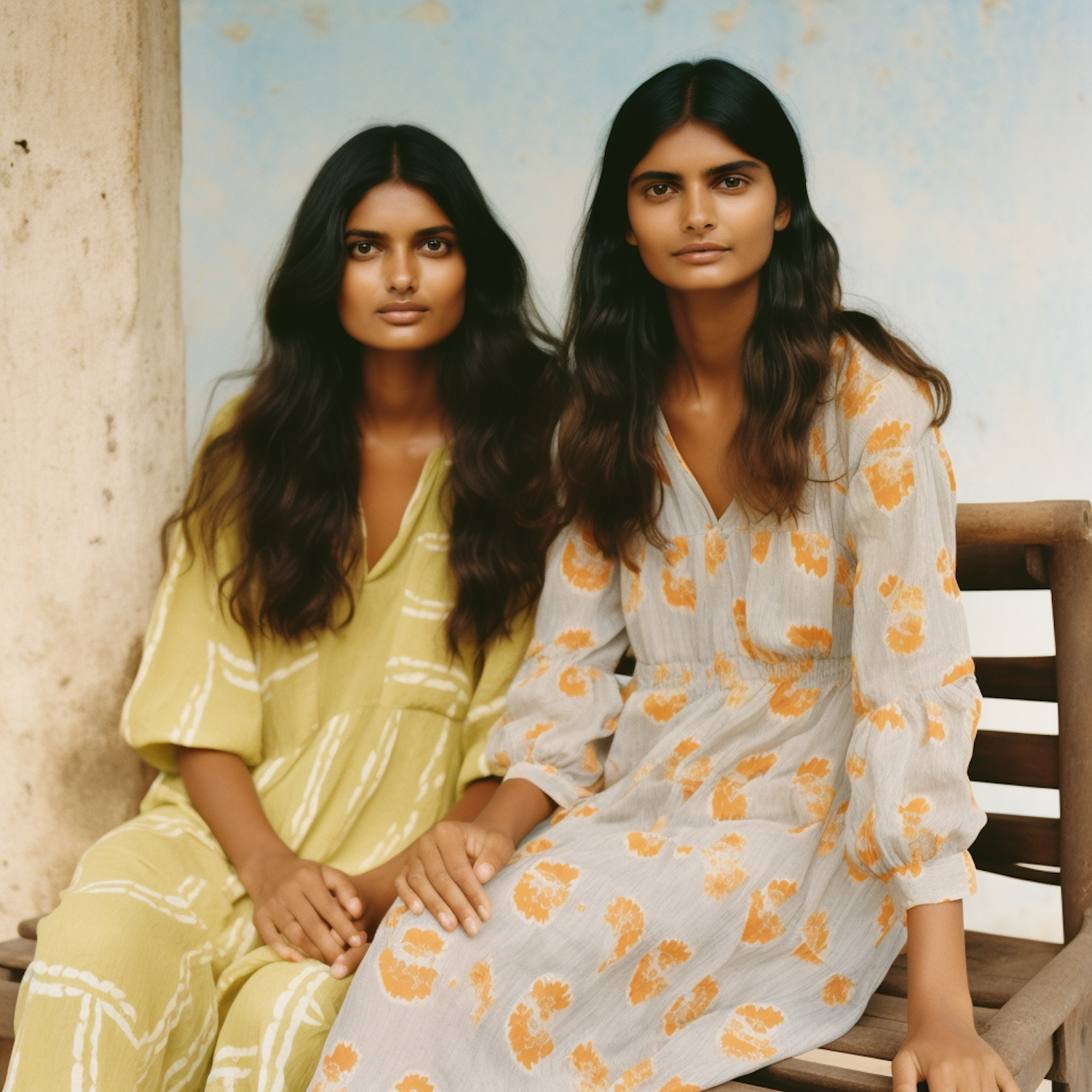 Two women in patterned dresses sit on a bench against a blue wall, exuding calm and elegance with their serene expressions and flowing hair.