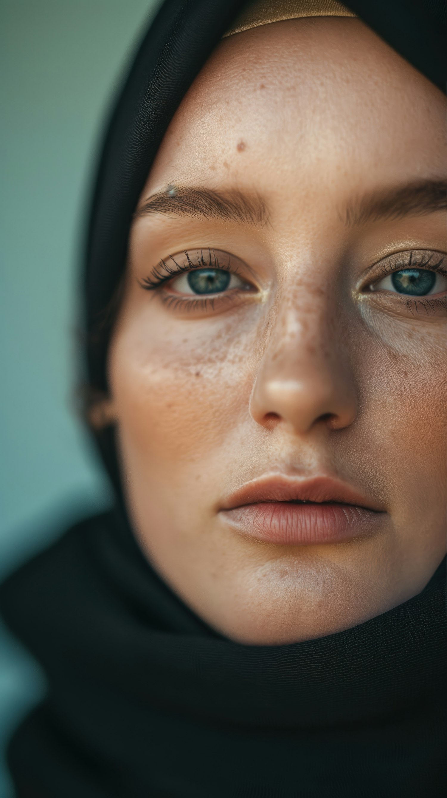 Close-up portrait of a woman with blue eyes and freckles, wearing a black headscarf. Her calm expression and natural beauty stand out.