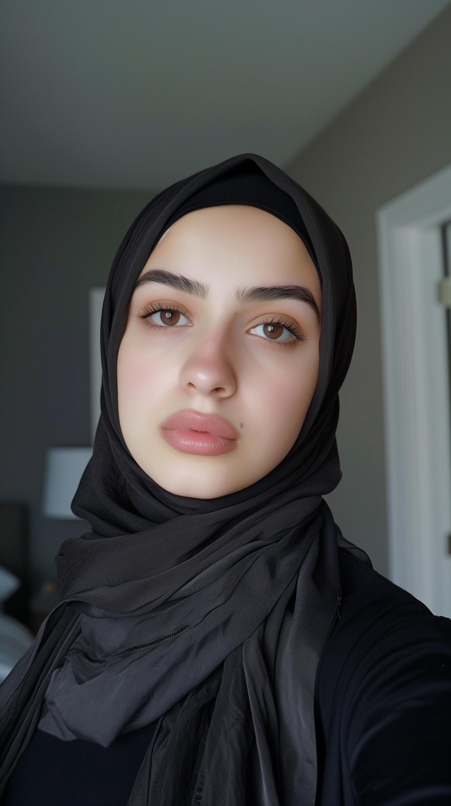 Portrait of a young woman in a black hijab with fair skin and brown eyes, set against a softly blurred interior background.