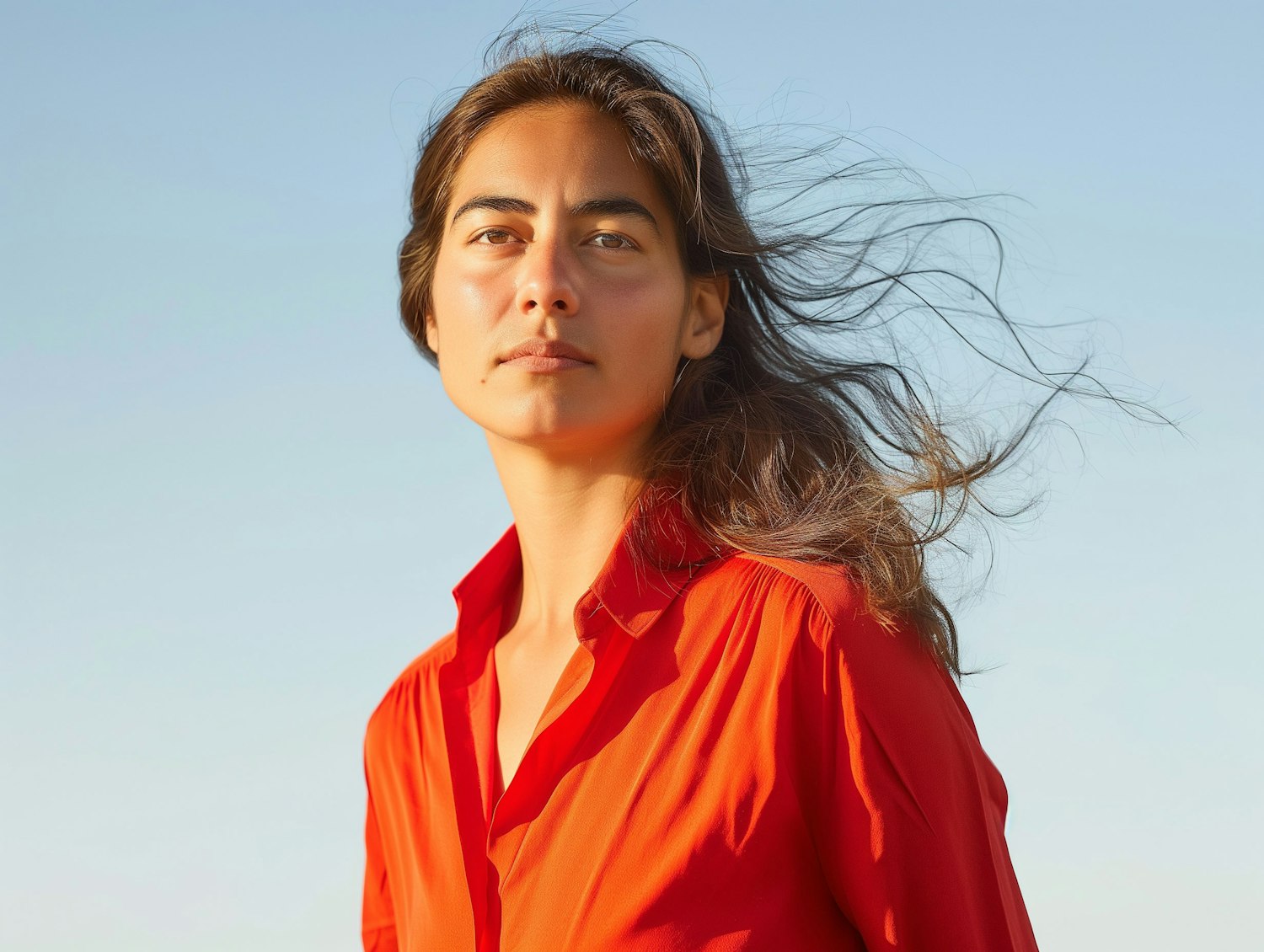 Woman in a red shirt with flowing hair against a clear blue sky, exuding calm and natural beauty.