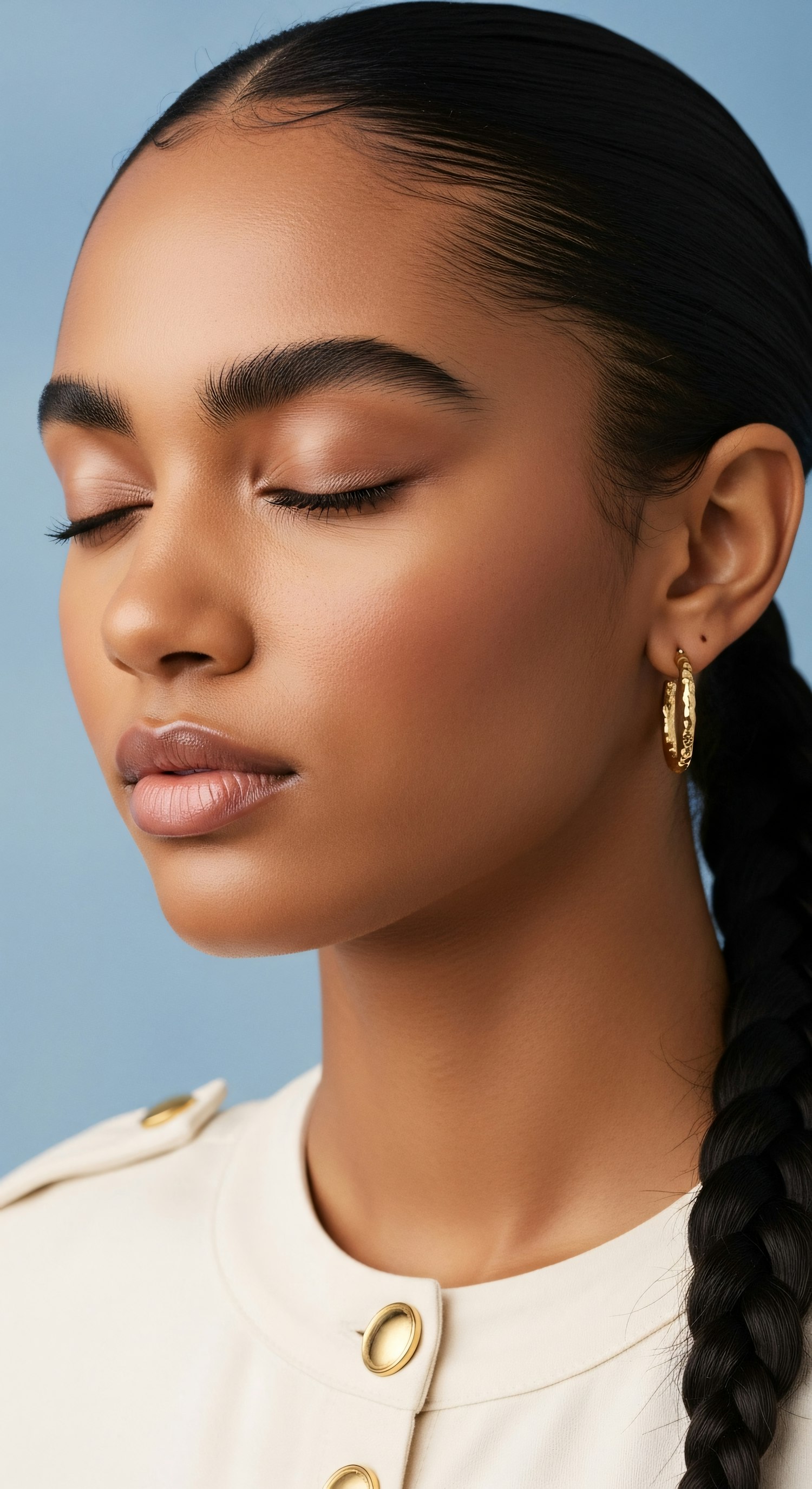 A serene portrait of a woman with eyes closed, styled hair, and elegant gold earrings, against a calming blue background.