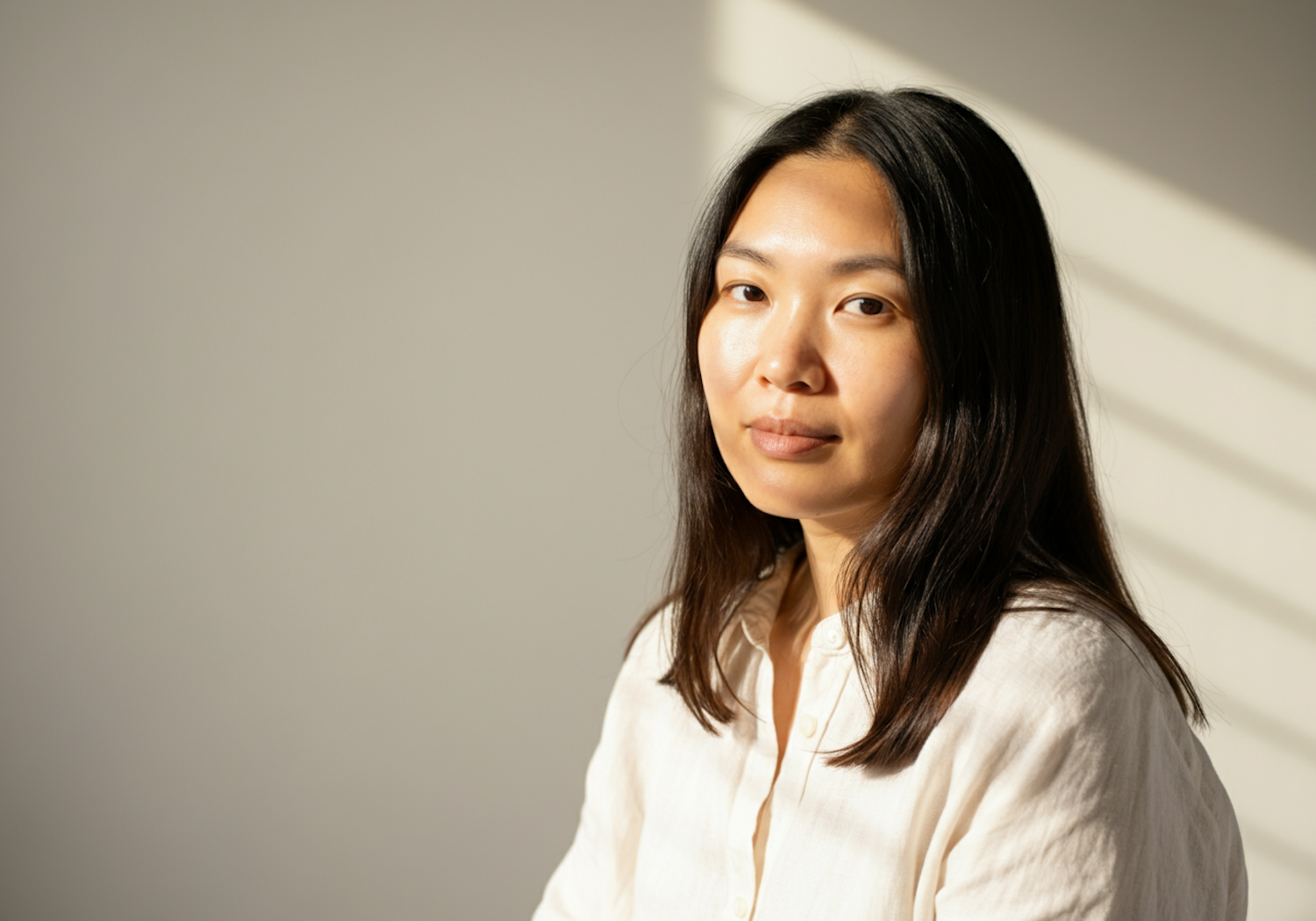 A serene portrait of a young Asian woman in soft sunlight, wearing a light beige shirt against a minimalistic background.