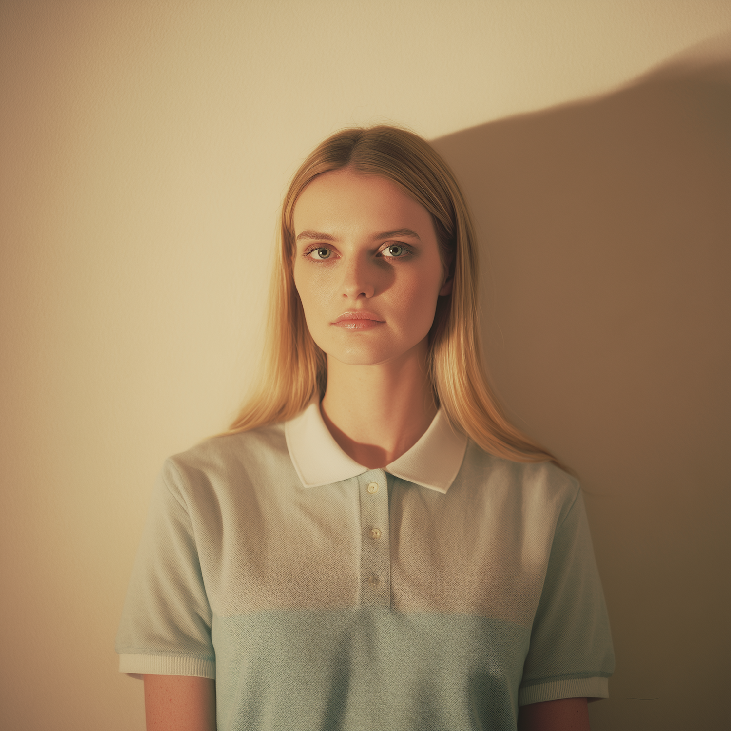 Portrait of a young woman with blonde hair in a light blue polo shirt, standing against a softly lit wall with a calm expression.